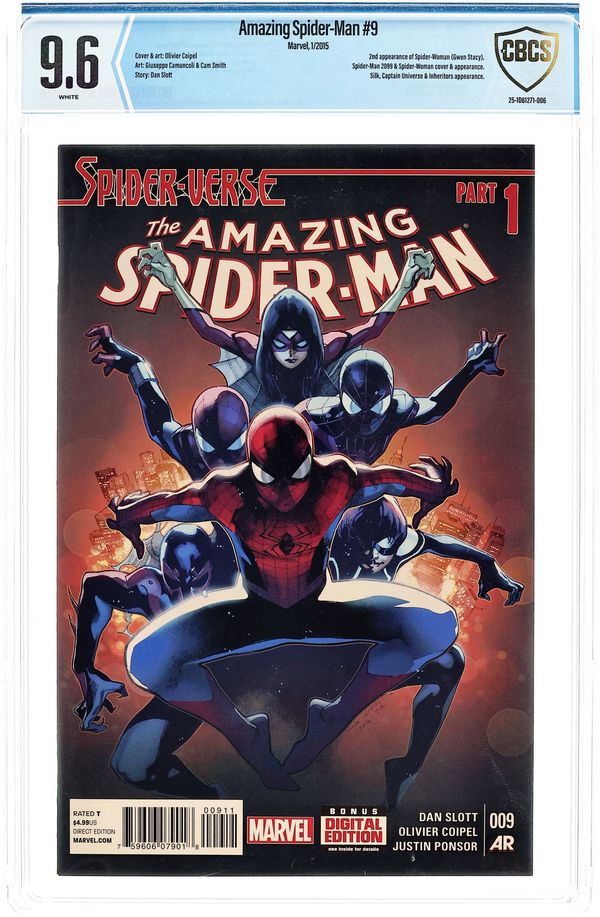 Ended Nov 24 7:19 PM CST Bid History 8 bids Winning Bid $20 Spider-Verse: Part 1 of 6 - Written by Dan Slott. Art by Olivier Coipel, Giuseppe Camuncoli and Cam Smith. Cover by Olivier Coipel. SPIDER-VERSE BEGINS HERE! When a force of evil threatens spider-characters throughout the multiverse, EVERY SPIDER-MAN EVER is needed to save the day! Cover price $4.99. Grade: CBCS 9.6 explanation of grade Condition: Used (collectible)