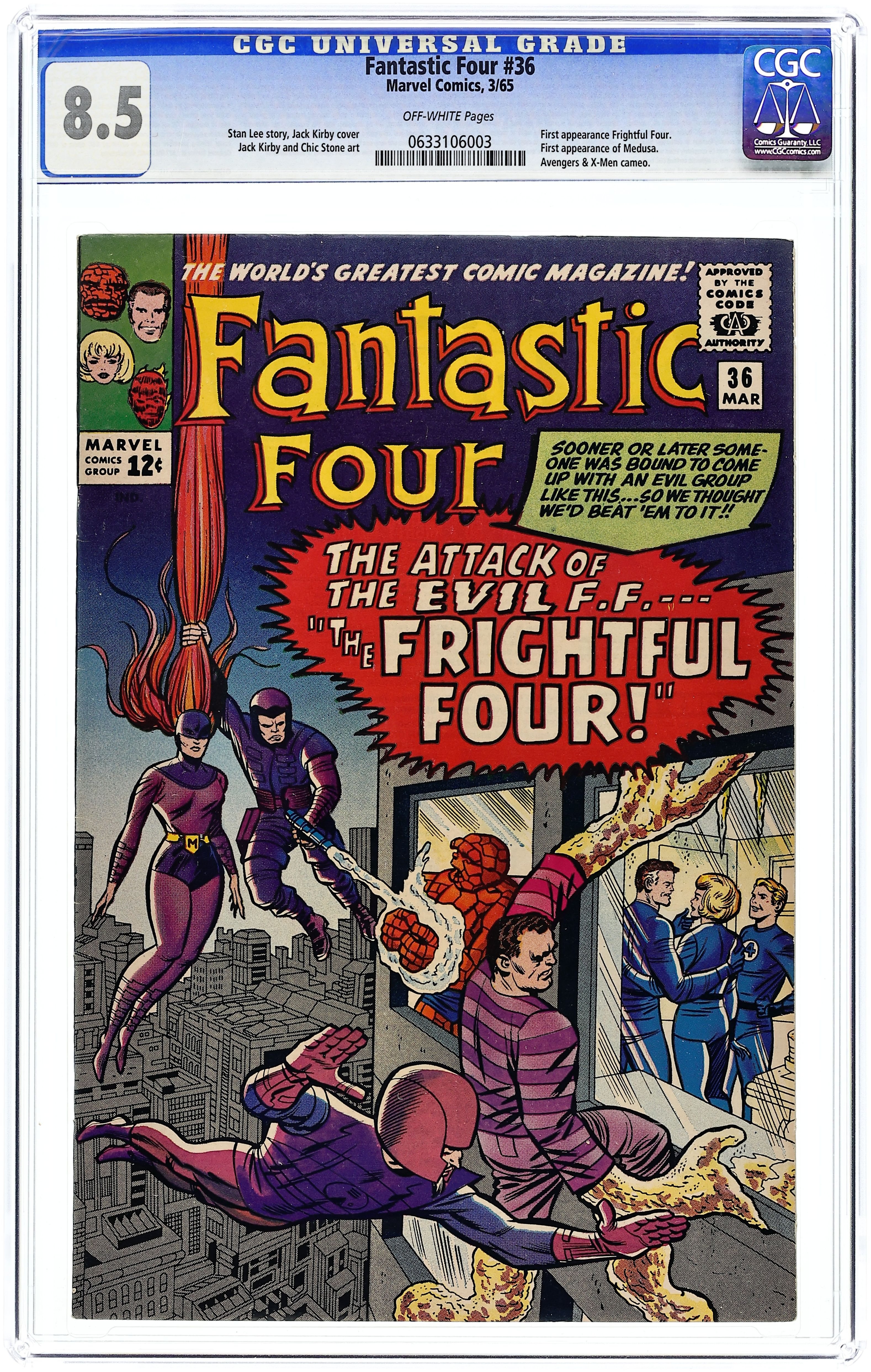 Cover pencils by Jack Kirby, inks by Chic Stone. Intro and first appearance of Madam Medusa (of the Inhumans) in The Frightful Four!, script by Stan Lee, pencils by Jack Kirby, inks by Chic Stone; Reed and Sue announce their engagement. The Wizard forms the Frightful Four and attacks the Baxter Building. The Frightful Four include Medusa, the Wizard, the Sandman, and Paste-Pot Pete. Brief appearances by the Avengers, the X-Men, and Spider-Man. Letter to the editor from comics artist Dave Cockrum. 36 pgs. $0.12. Cover price $0.12. Grade: CGC 8.5 explanation of grade Condition: Used (collectible)