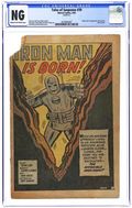 Starts Jan 3 Cover pencils by Jack Kirby, inks by Don Heck. First appearance of Iron Man in "Iron Man Is Born!", script by Stan Lee (plot) and Larry Lieber (script), art by Don Heck; Playboy industrialist and weapons designer Tony Stark is injured in Vietnam and captured by communists; While pretending to build a weapon for his captors he builds a suit of battle armor to keep his injured heart beating and uses it to escape and beat the communist commander. "The Treasure" text story. "The Last Rocket!", art by Gene Colan; When the sun starts dying humanity goes into space, except for two nature lovers; Just as the last rocket leaves a new sun flares to life, and the two remaining humans, Adam and Eve, rename the planet Earth. "Gundar!", script by Stan Lee, art by Steve Ditko; A shipwrecked man finds cursed Viking ghosts on an island, and his descent from the captain that cursed them releases them. 36 pages, full color. Cover price $0.12. Grade: CGC 0.1 explanation of grade Condition: Used (collectible)
