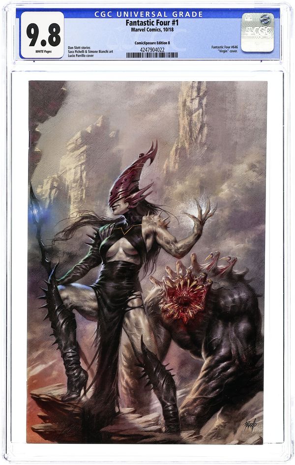 ComicXposure exclusive Virgin Cover by Lucio Parrillo. Written by Dan Slott. Art by Skottie Young, Sara Pichelli, and Simone Bianchi. FOUREVER Part One BECAUSE YOU DEMANDED IT - THE WORLD'S GREATEST COMIC MAGAZINE IS BACK! Since the end of SECRET WARS, there's been a gap in the Marvel Universe. A void no other team can fill. And it's time for the world to move on. But can it? A life-changing decision by the Thing! A momentous declaration by the Human Torch! A clarion call-to-arms that summons Doctor Doom! And a signal in the sky that heralds the return of hope to the Marvel Universe! All this, and Alicia Masters adopts kittens! So cute! Plus, the Impossible Man! AND BONUS STORIES ILLUSTRATED BY SIMONE BIANCHI AND SKOTTIE YOUNG! IF YOU READ ONLY ONE MARVEL COMIC THIS MONTH, THIS IS THE ONE! 48 pages, full color. Rated T Grade: CGC 9.8 explanation of grade Condition: Used (collectible)