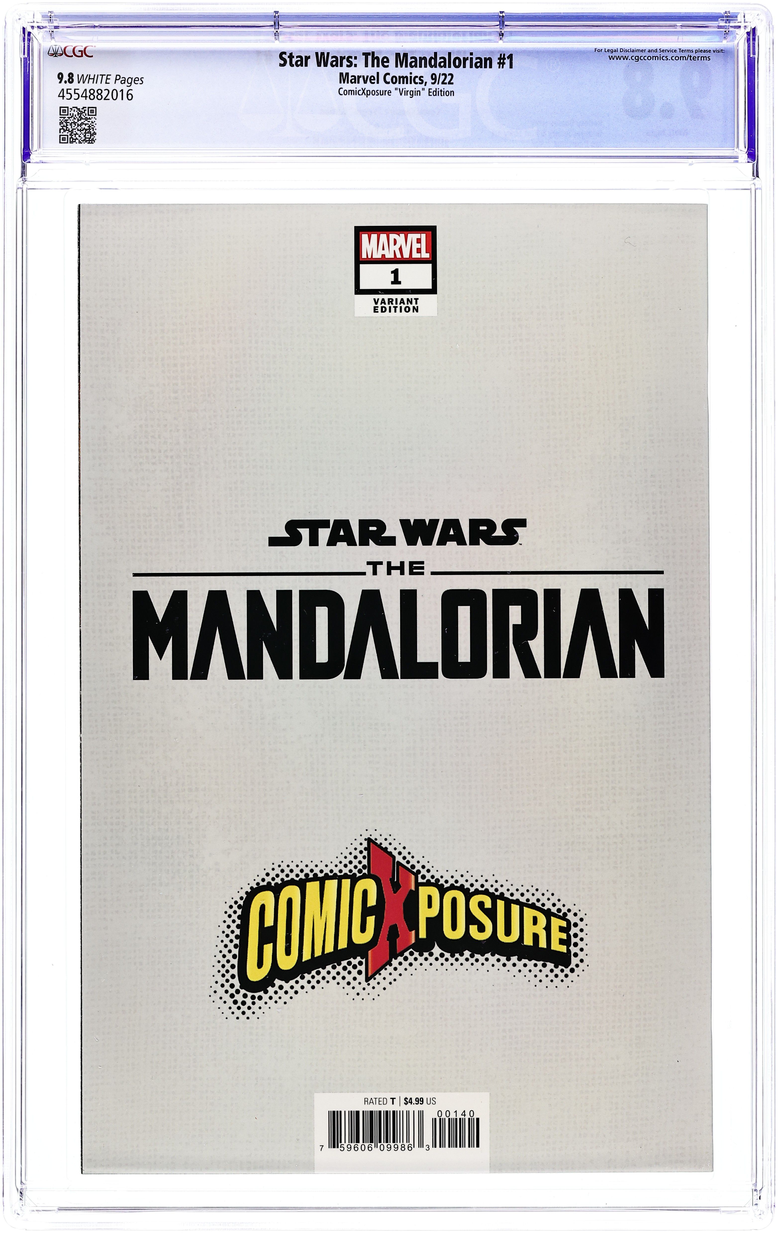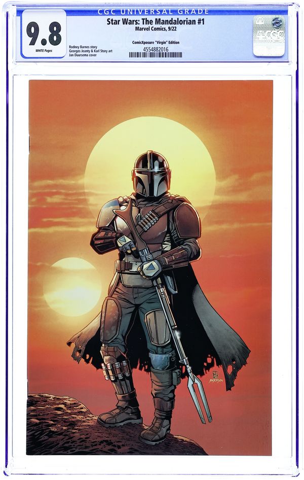 ComicXposure Exclusive Virgin Cover by Jan Duusema. Written by Rodney Barnes. Art by Georges Jeanty. For the first time, THE MANDALORIAN arrives in comics! The Mandalorian bounty hunter tracks a target for a well-paying, mysterious client. Witness the introduction of Din Djarin and the first meeting between the Mandalorian and the Child! 40 pages, full color. Rated T Grade: CGC 9.8 explanation of grade Condition: Used (collectible)