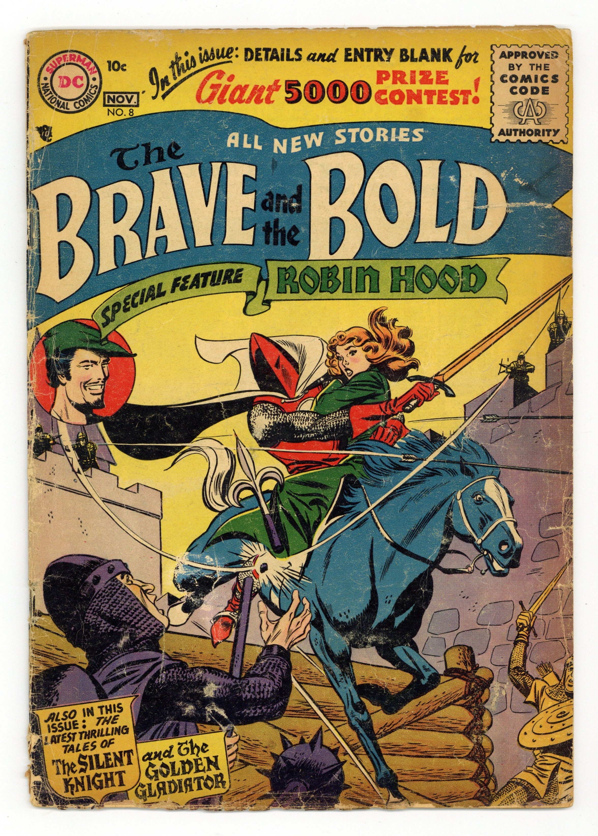 Cover by Irv Novick. "Challenge of the Grim Jester," script by Bill Finger, art by Russ Heath; A tournament in Prince John's castle has Robin Hood entering as a contender; Prince John tells him that if he fails three out of five challenges, he must surrender himself to the guards; Robin Hood agrees, then Prince John introduces the master of rules, Malvio, his court jester, and a known trickster. "The Outcast Viking," script by Bob Haney, art by Joe Kubert; The old seer, Baldur, predicts doom will come to the village as long as Jon stays within; The villagers vote to exile him, but they have a change of heart after he saves them from a stampede of unfrozen mastodons. Caesar's D-Day article by Jack Miller, art by Raymond Perry. "Secret of the Arabian Horse," script by Robert Kanigher, art by Irv Novick; A plot to unmask the Silent Knight comes about by Sir Edwin, when he gives a white, Arabian steed to Brian; The horse only responds to him, even when Brian dons his Silent Knight armor. 36 Pages, Full Color. Cover price $0.10. Grade: GD 2.0 explanation of grade Condition: Used (collectible)