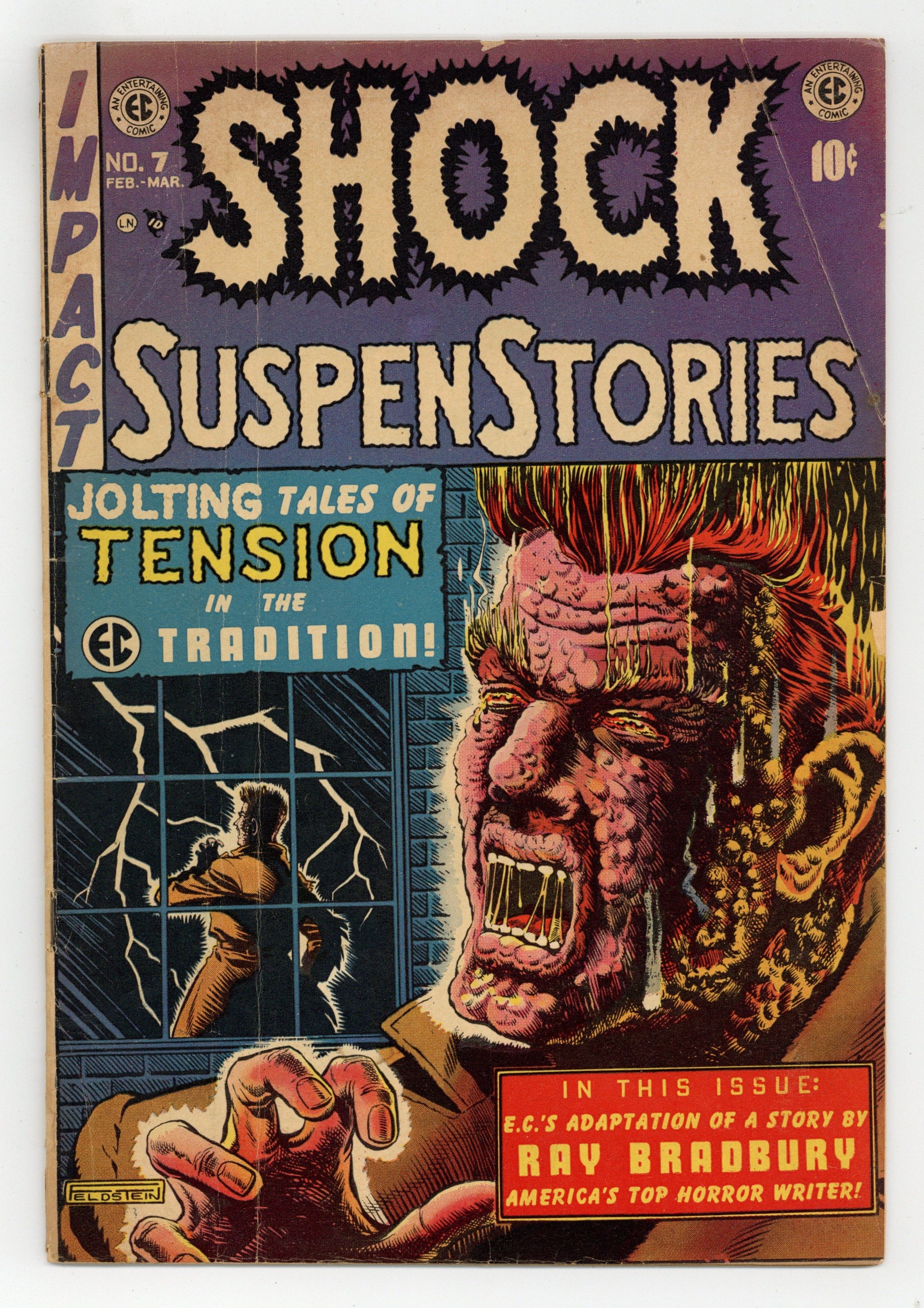 Cover art by Albert B. Feldstein. Beauty And The Beach!, script by Albert B. Feldstein, art by Jack Kamen; Two men are frustrated by the vanity of their attractive wives and the fact that they have offers to do some modeling and to participate in four beauty contests. The Bribe!, script by Albert B. Feldstein, art by Wally Wood; A fire inspector commits suicide when a fire breaks out in a night club where he took a bribe to overlook code violations; He thinks his daughter was killed in the fire with the other patrons because of a photo taken of her earlier that evening. The Mountain Jackal text story by Albert B. Feldstein. Infiltration, script by Albert B. Feldstein, art by Joe Orlando; This story postulates that a small government agency responsible for ferreting out Martian infiltrators is completely infested with Martian infiltrators except for a sole human whom they gun down. The Small Assassin!, script by Ray Bradbury and Albert B. Feldstein (adaptation), art by George Evans; a mother is paranoid that her newborn baby is attempting to kill her. 36 pgs. $0.10. Cover price $0.10. Grade: GD 2.0 explanation of grade Condition: Used (collectible)