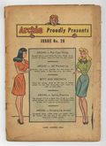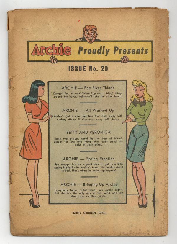 Cover by Al Fagaly. Stories by unknown. Art by Bill Vigoda, Al McLean and Pen Shumaker. Pop decides to fix a door and causes more damage than the atom bomb in "Pop Fixes Things"! Plus: Archie tries to invent an electrical dishwasher in "All Washed Up"; Mr. Weatherbee bans Betty from cheerleading at the swim meet in "'Ray!"; Mr. Andrews decides to play football with Archie's team and ends up winning the game for them in "Spring Practice"; and Archie tries to deliver a coffee grinder to the Red Cross auction, but keeps running into his skinny-dipping friends along the way in "Bringing Up Archie"! Also: Archie attempts to deliver a barrel of fish to a store owner in the 2-page text story "Any Fish Today"! And: "Archie Puzzle Page"! 52 pages, full color. Cover price $0.10. Grade: Coverless explanation of grade Condition: Used (collectible)