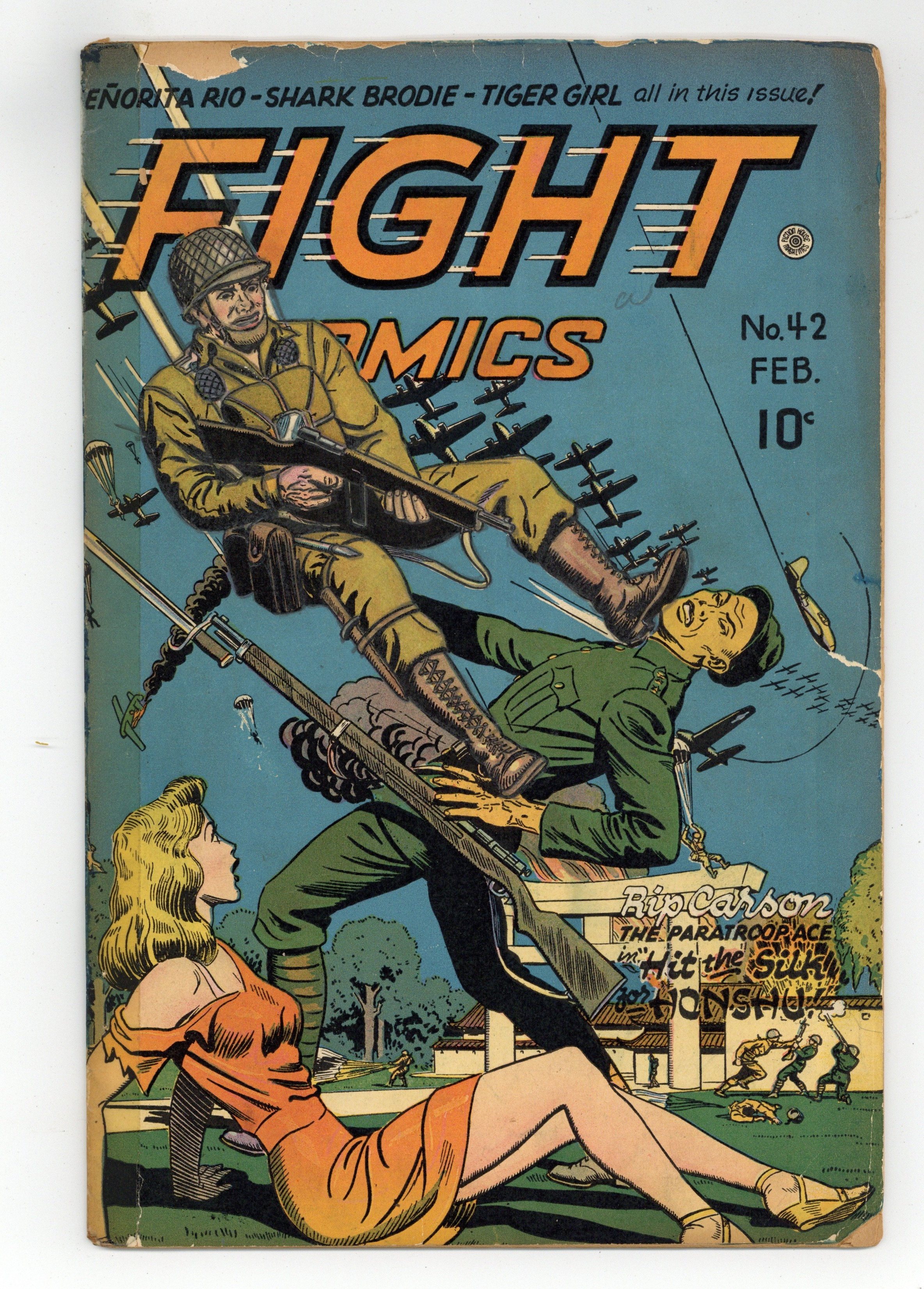 Cover by Joe Doolin. Edited by Jack Byrne and Jerry Iger. Stories and art by Robert Webb, Ann Brewster, Alex Blum, Lily Renee and Matt Baker. A combat-themed anthology from Fiction House that featured early work from many future comics legends (often uncredited) in the Eisner-Iger Shop. Investigating mysterious stampedes of cattle and rhinos, Sheena discovers underwater pygmies with spears; Hooks Devlin tries to clear his own girlfriend Peaches after she confesses to the murder of a millionaire; Glamour-girl turned super-spy Senorita Rio tracks a supposedly dead Nazi architect to South America. Featuring art by famed good-girl artist Matt Baker and pioneering female artist Lily Renee. Now It Can Be Told; Tiger Girl; Rip Carson; Hooks Devlin; Senorita Rio; Shark Brodie. 36 pages, Full Color. Cover price $0.10. Grade: PR 0.5 explanation of grade Condition: Used (collectible)