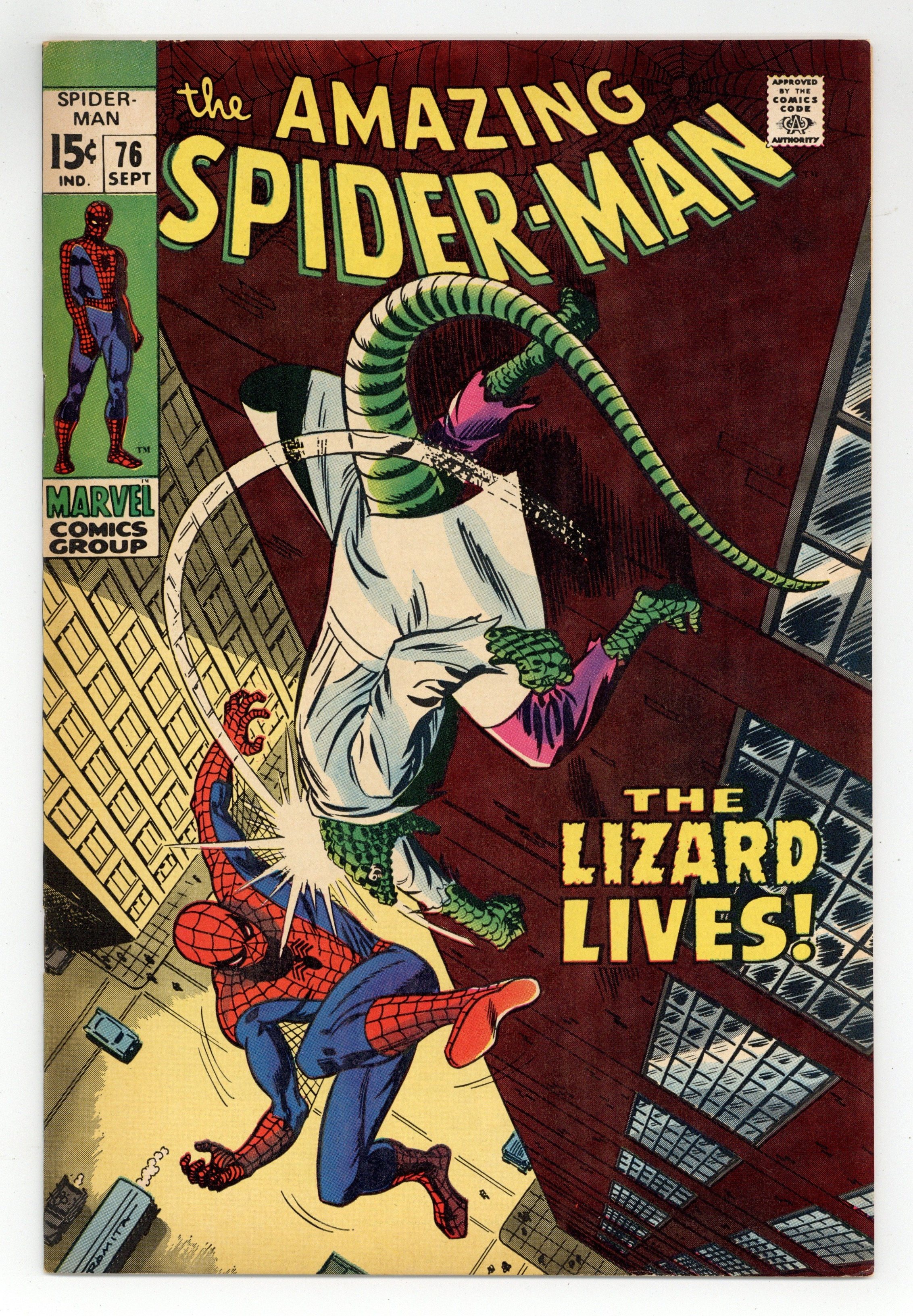 Starts Dec 15 "The Lizard Lives!" Part 1 of 2. Plot by John Buscema. Script by Stan Lee. Art by John Buscema (layouts) and Jim Mooney (finishes). Cover by John Romita. The Lethal Lizard is on the loose in New York City! And Dr. Connors' alter-ego has only one thing on his reptilian mind: destroy Spider-Man! Peter Parker knows that a ferocious fight against the Lizard awaits him, so he takes a moment to visit Gwen Stacy before searching for his scaled adversary. A while later on the East Side, the Lizard ambushes the web-slinger! And their dazzling donnybrook begins! However when the Lizard wraps his tail around the wall-crawler's neck -- it looks like curtains for your friendly neighborhood Spider-Man! Cameo appearances by Aunt May, Harry Osborn, Joe Robertson, Captain Stacy, Martha Connors, Billy Connors, and the Human Torch. (Note: This issue was reprinted in Marvel Tales #57.) 36 pages. Cover price $0.15. Grade: FN- 5.5 explanation of grade Condition: Used (collectible)