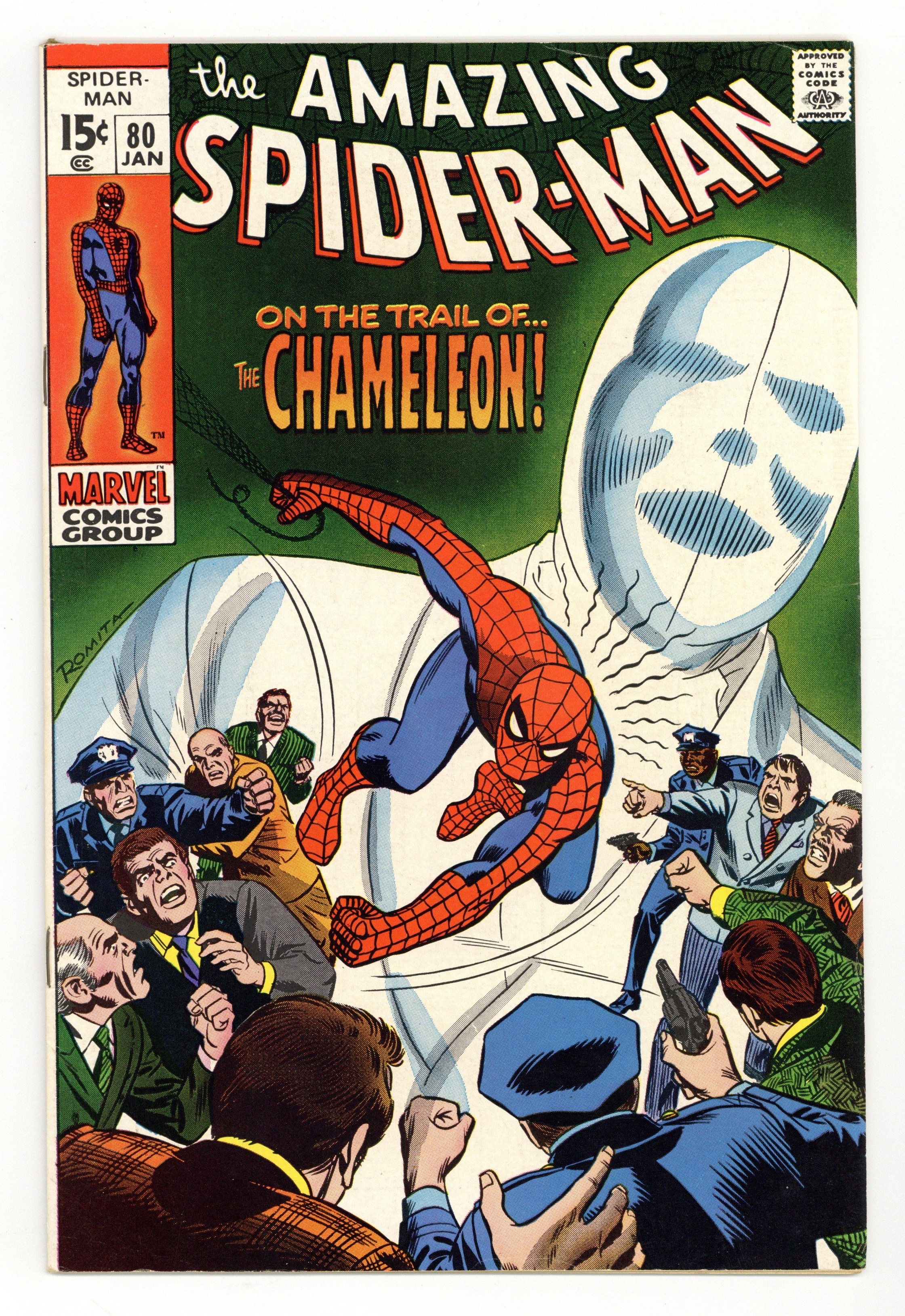 "On the Trail of the Chameleon!" Script by Stan Lee. Art by John Buscema (layouts) and Jim Mooney (finishes). Cover by John Romita. Peter Parker and Gwen Stacy meet for a date at the Midtown Museum to see its new exhibit of priceless paintings. And also at the museum is Gwen's father...who is in charge of security for the evening. So when the paintings are shockingly stolen, Captain Stacy gets blamed for the theft! Peter knows the trusted police captain would never do that. So who did? Ultimately, the web-slinger remembers the name of the Chameleon...and sets a trap for the master of disguise! However the Chameleon is crafty, and he eludes Spider-Man's trap -- until the faceless villain makes a very big mistake! Cameo appearances by Flash Thompson, Harry Osborn, J. Jonah Jameson, and Joe Robertson. (Notes: The wall-crawler previously encountered the Chameleon in Amazing Spider-Man (1st series) #15. This story was reprinted in Marvel Tales #61.) 36 pages. Cover price $0.15. Grade: FN- 5.5 explanation of grade Condition: Used (collectible)