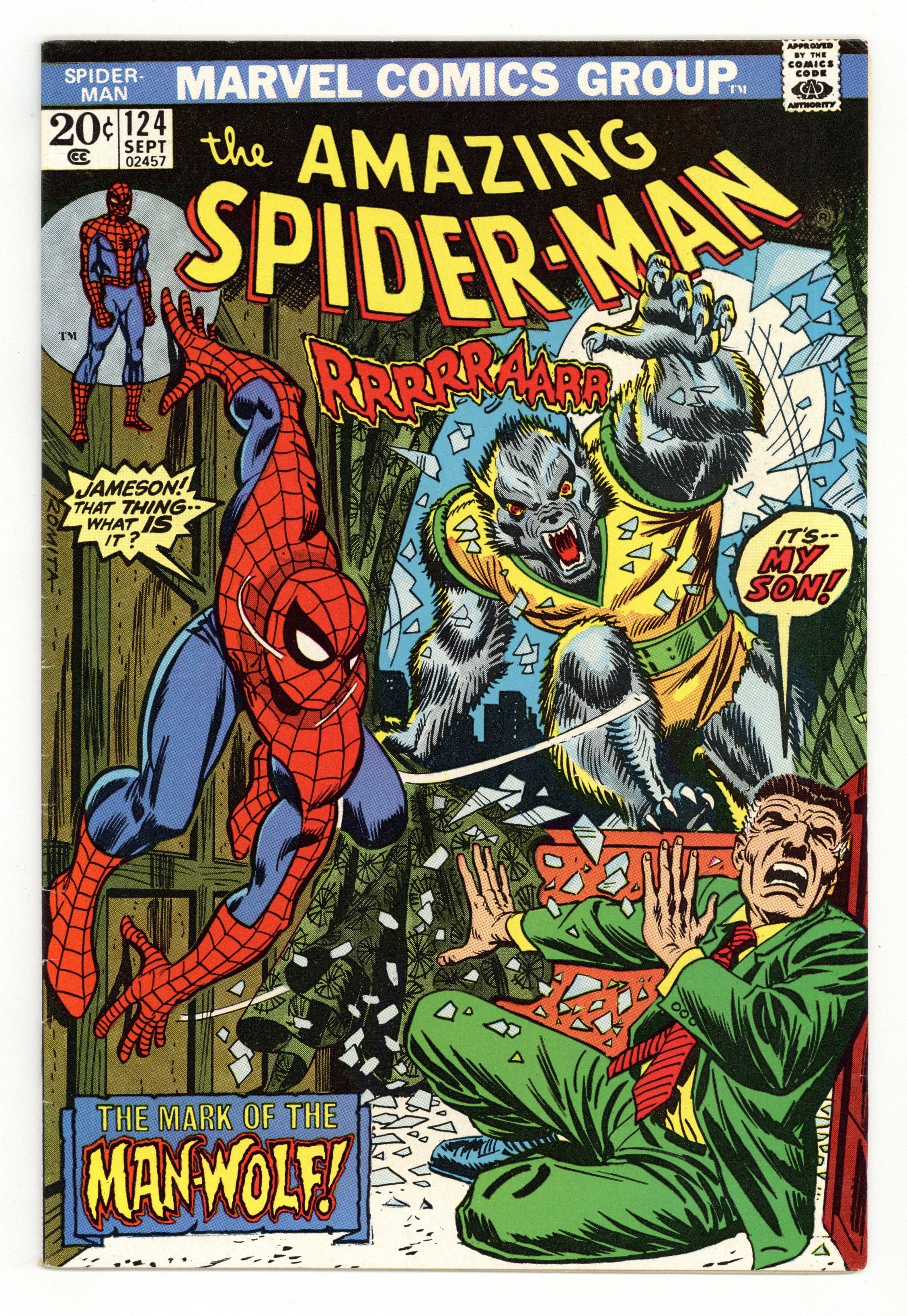 First appearance of the Man-Wolf (aka John Jameson) in "The Mark of the Man-Wolf" Part 1 of 2. Script by Gerry Conway. Pencils by Gil Kane. Inks by John Romita and Tony Mortellaro (backgrounds). Cover by John Romita. While web-swinging through the city, Spider-Man stops to look at the local newspapers. He becomes angry when the Daily Bugle is the only newspaper calling him a murderer -- in connection with the death of Norman Osborn! The livid wall-crawler rushes to JJJ's apartment, but someone else gets their first: the Man-Wolf! Oh my! As shown on the terrific cover, Spider-Man battles the Man-Wolf to save J. Jonah Jameson! First appearance of Kristine Saunders. Cameo appearances by Mary Jane Watson, Flash Thompson, and Joe Robertson. (Notes: In the letters page, the web-slinger's fans react to Gwen Stacy's death. This story was reprinted in Marvel Tales 101.) 36 pages. Cover price $0.20. Grade: FN+ 6.5 explanation of grade Condition: Used (collectible)