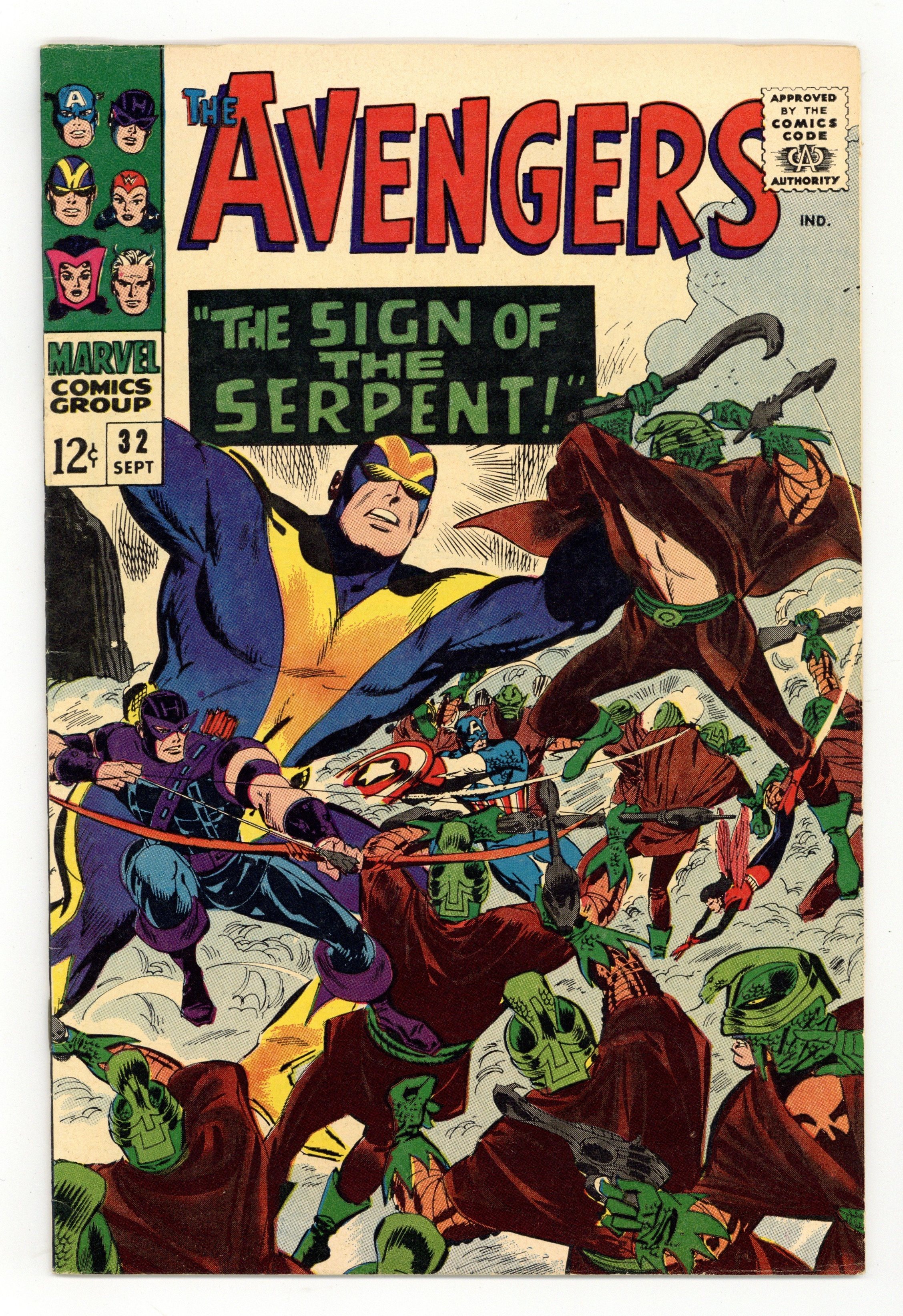 Cover by Don Heck. "The Sign of the Serpent!", script by Stan Lee, pencils by Don Heck; Captain America encourages Goliath to keep looking for a solution to his height-switching ability and finds a new assistant, Bill Foster; The Sons of the Serpent attack foreign people, including General Chen, the dictator of a communist country while he visits the UN; The Black Widow provides information to Hawkeye to prove herself to him. Quicksilver and the Scarlet Witch discover they will regain their full powers; Bill Foster, being African-American, gets attacked by the Sons of the Serpent; Captain America goes to Nick Fury for more information about them; The Avengers vow to defeat the Sons of the Serpent, but Captain America is kidnapped. Avengers roll call: Captain America, Hawkeye, Goliath, the Wasp, and, briefly, Quicksilver and the Scarlet Witch. Tony Stark (Iron Man) and Nick Fury guest appearances. Reprinted in Giant-Size Marvel Triple Action #2. 36 pgs., full color. $0.12. Cover price $0.12. Grade: FN- 5.5 explanation of grade Condition: Used (collectible)