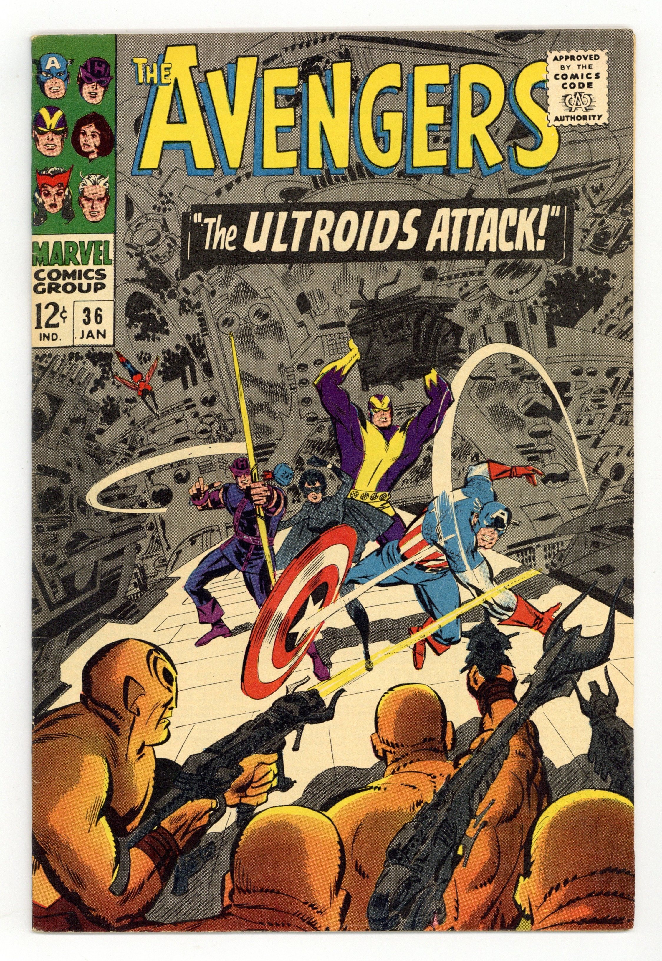 "The Ultroids Attack!" Part 1 of 2. Script by Roy Thomas. Art by Don Heck. Cover by Don Heck. The Scarlet Witch arrives at Avengers Mansion...and says that her brother Pietro has been kidnapped by aliens! Oh my, the assembled avengers are stunned by the news. And after Hawkeye and Goliath (back to his normal height) finish arguing about membership for the Black Widow, Earth's Mightiest Heroes and Natasha depart for the Balkans to rescue Quicksilver! Upon arrival in Transia, the Scarlet Witch leads the team to the location of the mysterious spaceship. And when the Avengers go inside, they discover Pietro captive...and Wanda too! Hold on, so then who's been guiding the Avengers since they left the United States? Meet Ixar, Ultrana, and the Ultroids -- the next alien race to conquer the planet Earth! Avengers Lineup: Captain America, Goliath, Hawkeye, Quicksilver, Scarlet Witch, and the Wasp. (Note: This issue was reprinted in Marvel Triple Action #28.) 36 pages. Cover price $0.12. Grade: FN- 5.5 explanation of grade Condition: Used (collectible)