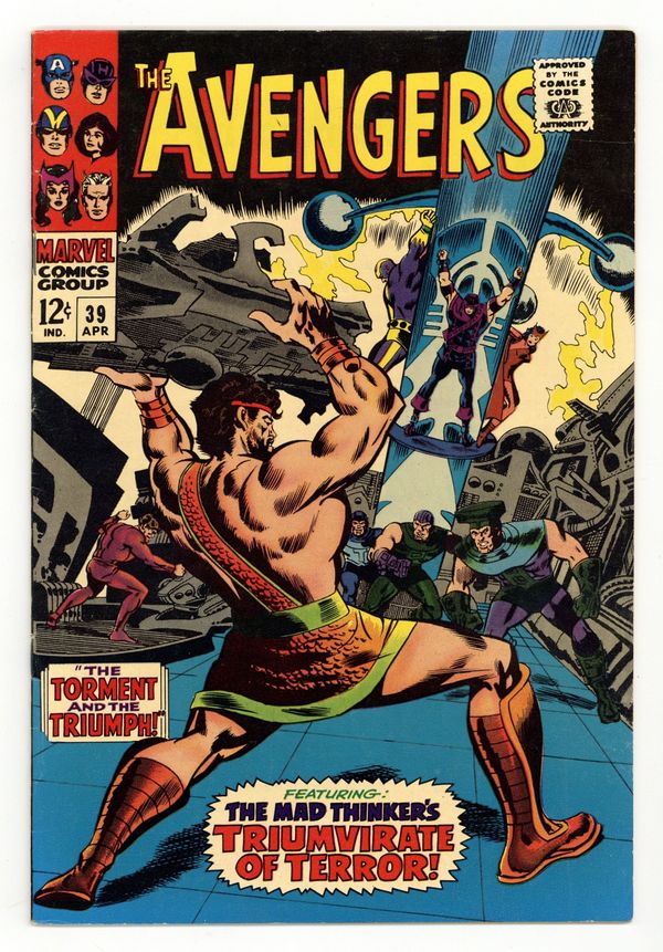"The Torment...and the Triumph!" Script by Roy Thomas. Pencils by Don Heck. Inks by George Roussos (as George Bell). Cover by Don Heck and George Roussos. After last issue's battle, the Lord of Olympus exiled Hercules to Earth for one year. So, the Avengers have a new associate or new teammate for the next 12 months! In the meantime, Hawkeye learns distressing news about the Black Widow. And he decides to go for a walk through the Lower East Side to clear his head. But the ace archer inadvertently walks right into a trap...set by the Mad Thinker! And it's only the beginning as the Mad Thinker sends Hammerhead, Piledriver, and Thunderboot to subdue Earth's Mightiest Heroes. The criminal genius' detailed plan works perfectly...until he encounters Olympus' mightiest hero! With his awesome strength, the Prince of Power disrupts the Mad Thinker's precise calculations -- and gives the Avengers a chance to rally and win! Cameo appearances by Nick Fury, Dum Dum Dugan, and Jasper Sitwell. Avengers Lineup: Goliath, Hawkeye, Hercules, Quicksilver, Scarlet Witch, and the Wasp. (Note: This issue was reprinted in Marvel Triple Action #31.) 36 pages. Cover price $0.12. Grade: VG/FN 5.0 explanation of grade Condition: Used (collectible)