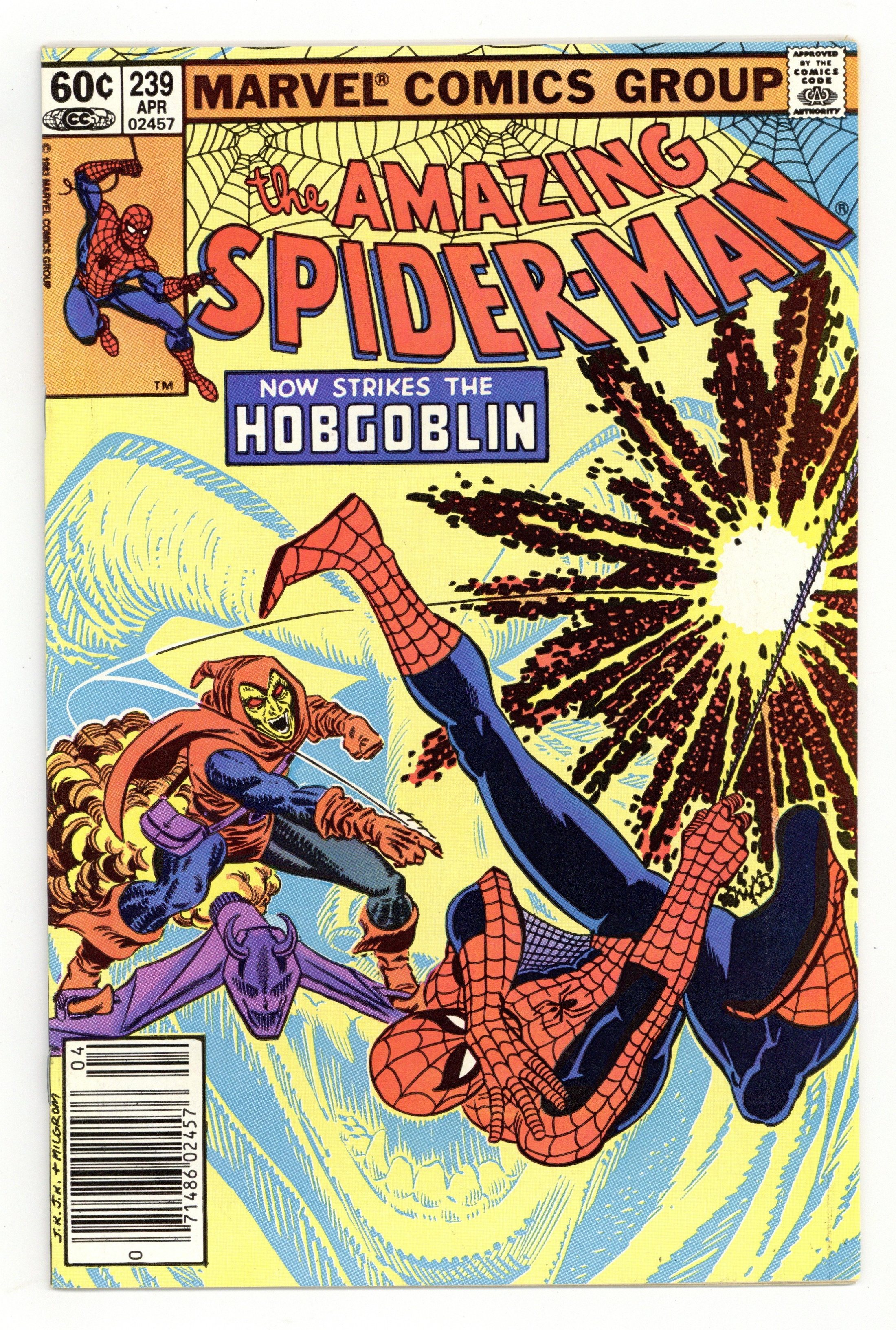Starts Dec 8 Newsstand Edition. "Now Strikes the Hobgoblin!" Second appearance of the Hobgoblin. Script by Roger Stern. Art by John Romita Jr. (breakdowns) and Frank Giacoia (finishes). Cover by John Romita Jr. and Al Milgrom. It's the first fight between the Hobgoblin and the Amazing Spider-Man! And the all-out action begins after the web-slinger bumps into the new goblin at one of Norman Osborn's old hideouts! Spidey is very familiar with the goblin's bag of tricks! But the overmatched Hobgoblin doesn't have any idea about the wall-crawler's speed, strength, and agility! Is the Hobgoblin's criminal career going to be over before it even starts? An outstanding issue! Cameo appearances by Harry Osborn, Madame Web, Captain DeWolff, and the Black Cat. (Notes: The Hobgoblin returns in Amazing Spider-Man 244. This issue was reprinted in Marvel Tales 258.) 36 pages. Cover price $0.60. Grade: VF 8.0 explanation of grade Condition: Used (collectible)