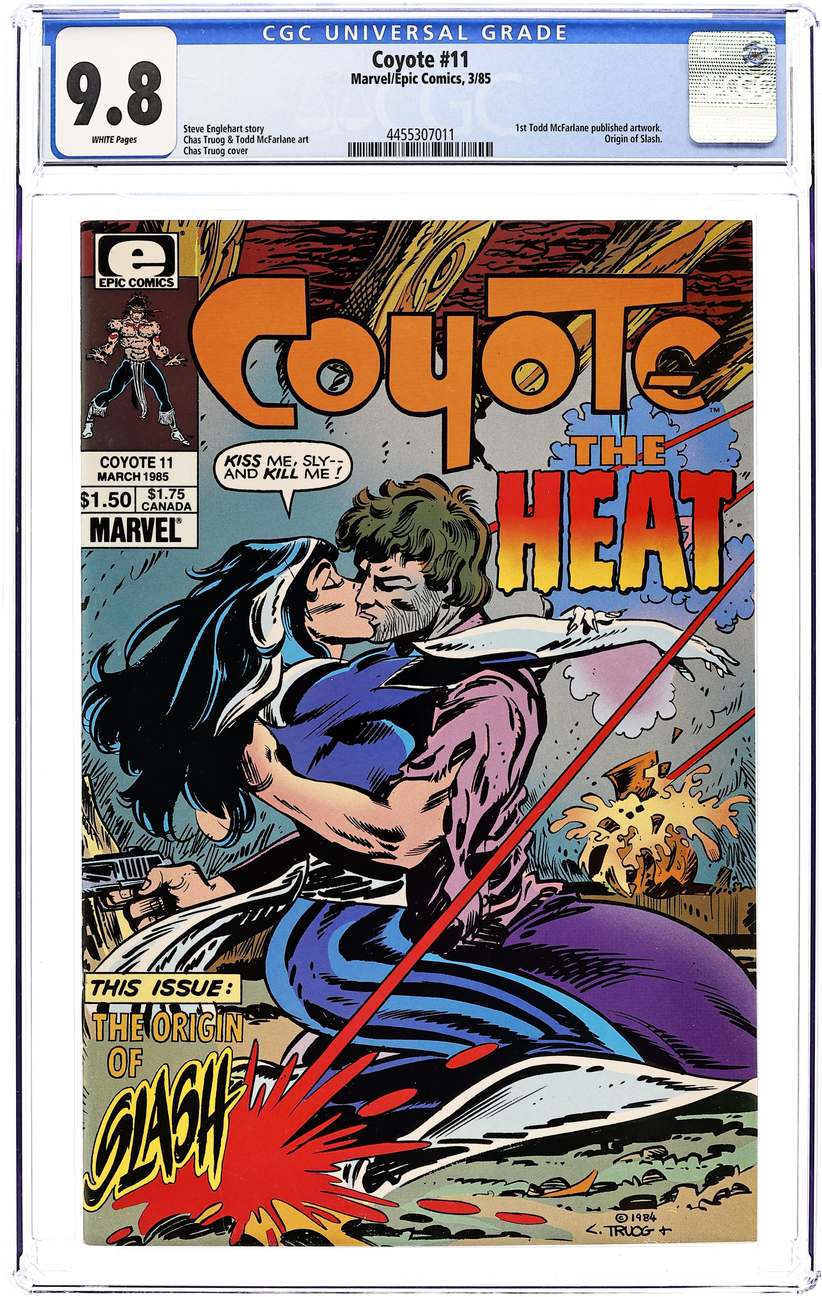 1st Todd McFarlane art in comics. "The Heat!" Written by Steve Englehart. Art by Chas Truog and Richard Howell. Has Coyote fallen for his enemy? Plus, The origin of "Slash!" Written by Steve Enlehart. Art by Todd McFarlane. Cover price $1.50. Grade: CGC 9.8 explanation of grade Condition: Used (collectible)