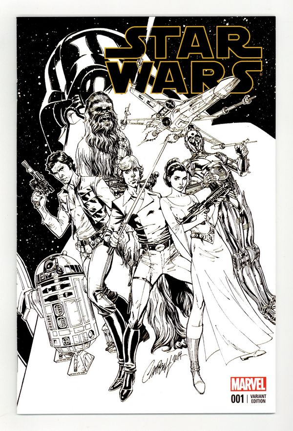 Starts Feb 9 Four Color Grails Sketch Variant. Cover by J. Scott Campbell. Written by Jason Aaron. Art by John Cassaday. THE GREATEST SPACE ADVENTURE OF ALL TIME RETURNS TO MARVEL! Luke Skywalker and the ragtag band of rebels fighting against the Galactic Empire are fresh off their biggest victory yet-the destruction of the massive battle station known as the Death Star. But the Empire's not toppled yet! Join Luke along with Princess Leia, smugglers Han Solo and Chewbacca, droids C-3PO and R2-D2 and the rest of the Rebel Alliance as they strike out for freedom against the evil forces of Darth Vader and his master, the Emperor. This is the Star Wars saga as only Marvel Comics could make it! 48 pages, full color. Rated T Grade: VF 8.0 explanation of grade Condition: Used (collectible)
