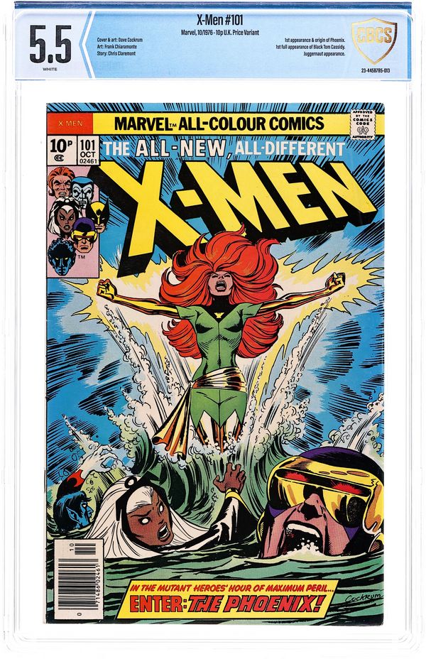 Ended Dec 1 2025 Bid History 13 bids Winning Bid $191 UK edition. Identical to US edition, but has 10p cover price. "Like a Phoenix, from the Ashes!" Part 1 of 3. Story by Chris Claremont. Art by Dave Cockrum and Frank Chiaramonte. In the startling aftermath of last issue's events, the X-Men crash-land back on Earth, but they soon learn that a unbelievable change has come over Jean Grey. Don't miss the rise of the Phoenix! Meanwhile, the team decides to take in some much needed R&R. They head to Ireland to Banshee's ancestral home. However, nothing but danger and death wait for them here. NOTE: 1st appearance of Phoenix, 1st appearance of Black Tom Cassidy, and Juggernaut cameo. Grade: CBCS 5.5 explanation of grade Condition: Used (collectible)