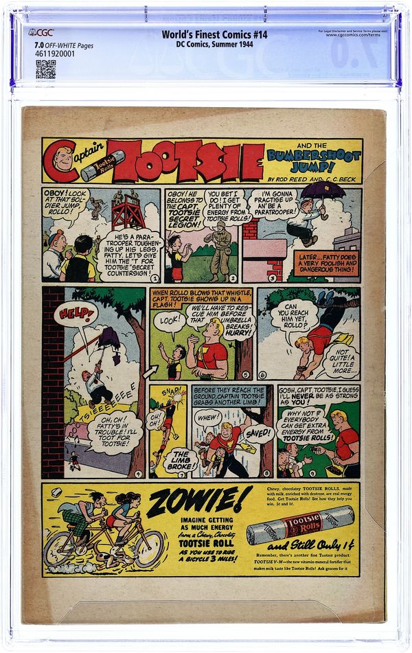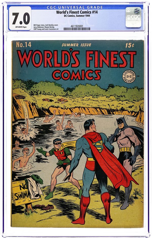 Cover art by Jack Burnley. Desert Town! starring Superman, pencils by Joe Shuster and Wayne Boring [as Joe Shuster], inks by George Roussos [as Joe Shuster]; Jim Jaspers wants to keep his town in Painted Valley a ghost town, but when criminals invade his domain (having kidnapped Lois and stolen a valuable ruby back in Metropolis) and discover his mother lode of gold, Superman has to enter the picture. High Finance starring The Green Arrow, pencils by Cliff Young, inks by Steve Brodie. Special Delivery starring Drafty, art by Stan Kaye. Thuggery In The Theatre starring The Star Spangled Kid and Stripesy, pencils by Cliff Young, inks by Steve Brodie. Superman stars in a one-page public service announcement, Turn Waste Paper Into War Weapons!, art by John Sikela. Task Force To Tokyo starring The Boy Commandos. The History of the Harried starring Zatara, art by William F. White. Salvage Scavengers! starring Batman and Robin, script by Bill Finger, pencils by Jerry Robinson [as Bob Kane], inks by George Roussos [as Bob Kane]; Mysterious boat sinkings and explosions, used to cover those explosions, lead the Dynamic Duo into a case involving deep sea salvaging. 84 pages, Full Color. Cover price $0.15. Grade: CGC 7.0 explanation of grade Condition: Used (collectible)