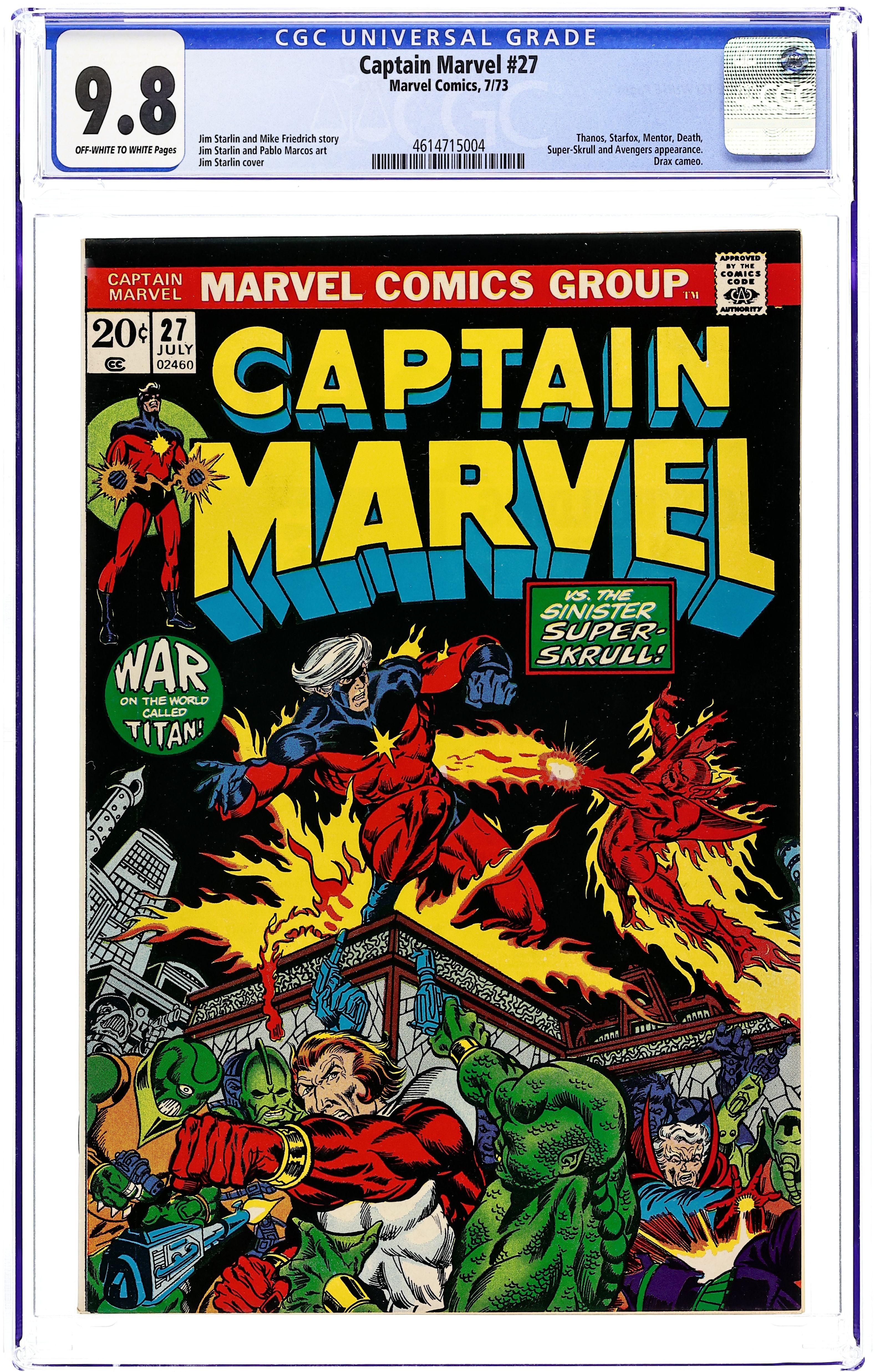 The Super-Skrull continues to pester Captain Marvel in "Trapped on Titan!" Script by Mike Friedrich, plot and pencils by Jim Starlin, inks by Pablo Marcos. Meanwhile, Thanos seeks out the Cosmic Cube. Cameos by the Thing (of the Fantastic Four), the Avengers (Captain America, Iron Man, the Scarlet Witch, the Vision, and the Black Panther), and Drax the Destroyer. This issue also contains a map of Titan. Cover price $0.20. Grade: CGC 9.8 explanation of grade Condition: Used (collectible)