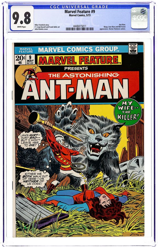 "The Killer Is My Wife!" Starring the Ant-Man and the Wasp. Script by Mike Friedrich. Pencils by Craig Russell. Inks by Frank Bolle. Cover by Craig Russell and Jack Abel. Ant-Man is trapped at ant-size, and to make matters worse, he has two baddies to battle: his own wife, who has mutated into a killer wasp, and one mean tabby cat! Also features the first appearance of Doctor Nemesis. Cameo appearances by Iron Man, David Cannon (aka Whirlwind), and Bill Foster. 32 pages. Cover price $0.20. Grade: CGC 9.8 explanation of grade Condition: Used (collectible)