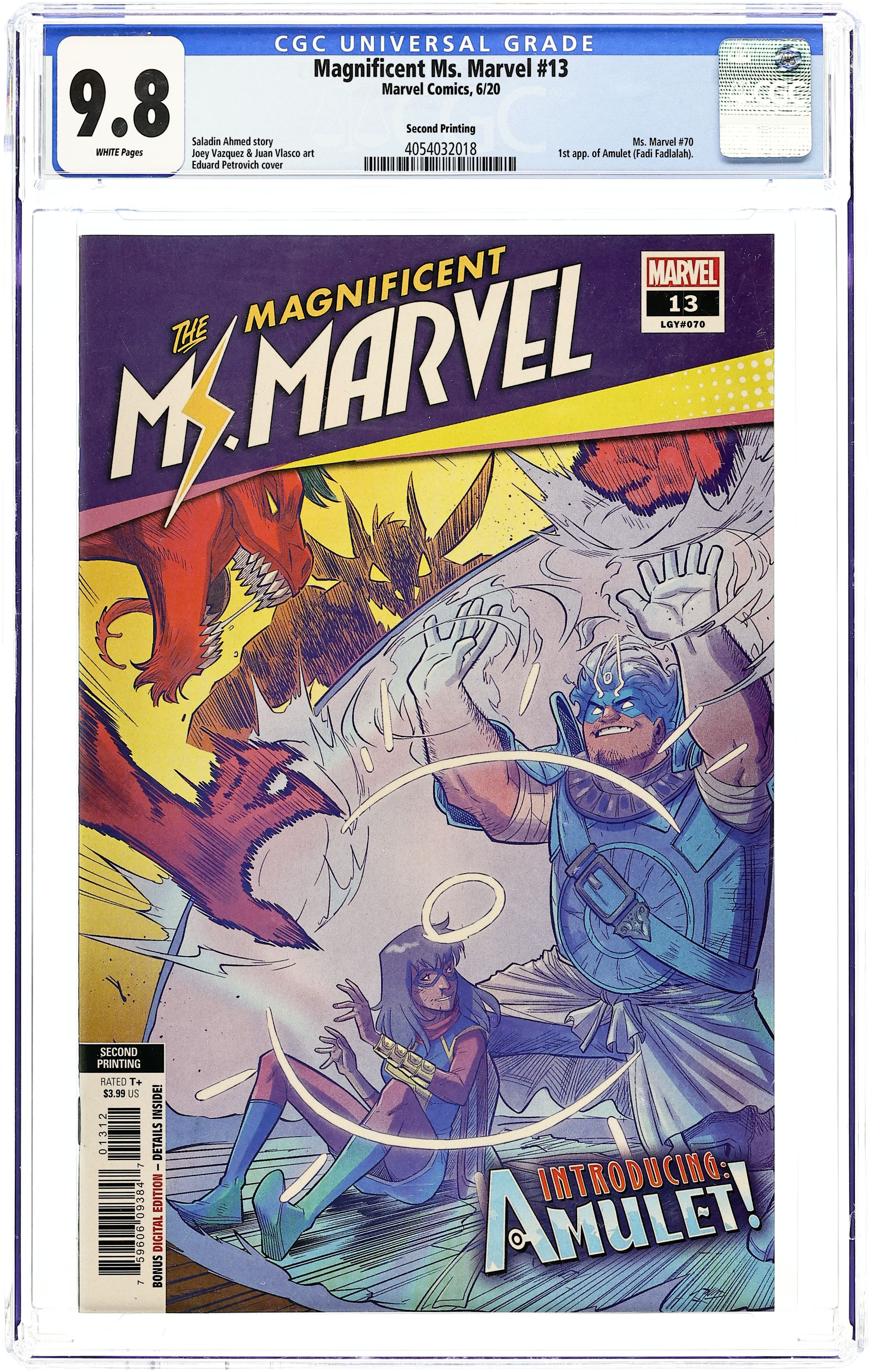 2nd Printing. Written by Saladin Ahmed. Art and Cover by Joey Vazquez. This town ain't big enough for the both of 'em. Or is it? There's a new hero in Jersey City! Introducing FADI FADLALAH, A.K.A. AMULET! What secrets is this gentle giant hiding? Is he friend or foe? And why's he showing up now, just when Kamala got her life back on track? Read and find out, True Believer! 28 pages, full color. Rated T+ Cover price $3.99. Grade: CGC 9.8 explanation of grade Condition: Used (collectible)