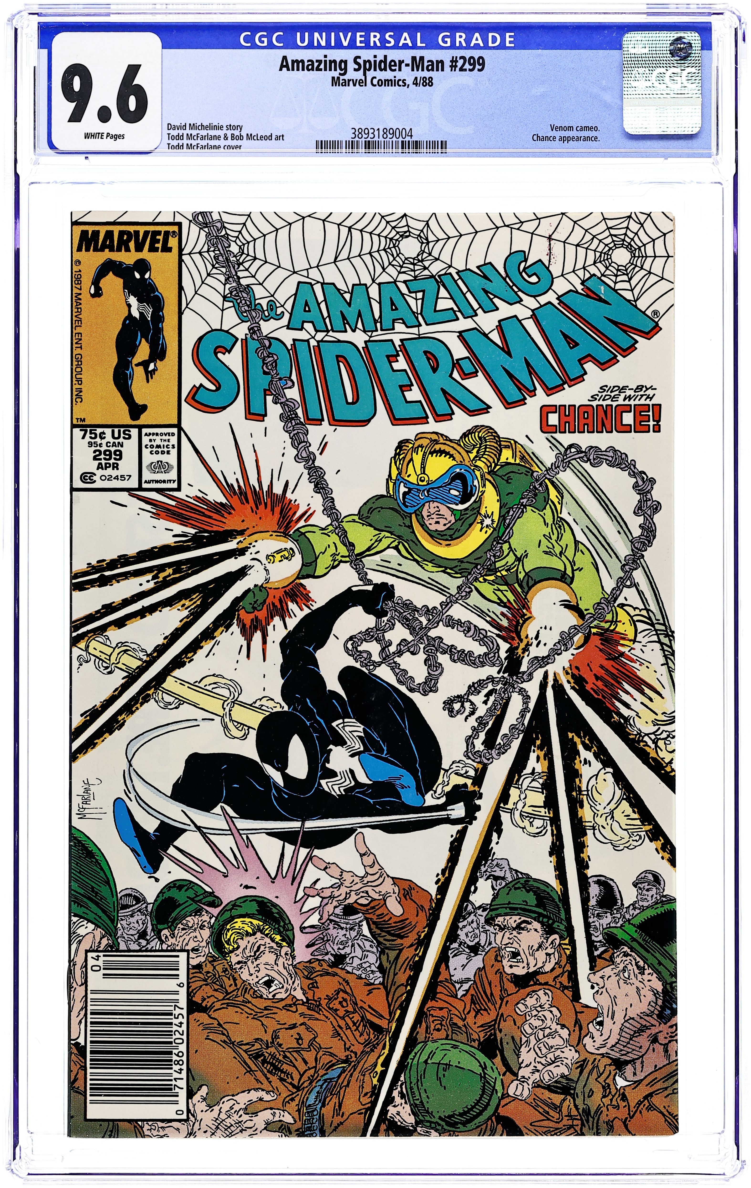 Newsstand Edition. "Survival of the Hittist!" Part 2 of 2. Script by David Michelinie. Pencils by Todd McFarlane. Inks by Bob McLeod. Cover by Todd McFarlane. After their waterfront arms theft goes awry, the Life Foundation turns the tables on Chance! The mysterious survivalist group abducts the mercenary and takes him to their secret headquarters in northern New Jersey! But thanks to a well-placed spider tracer, the web-slinger infiltrates the foundation's secluded colony the next day...and rescues Chance! So now the adversaries of 24 hours ago suddenly become allies to avoid death...courtesy of the Life Foundation! First appearance (and cameo on the last page) by Venom. Cameo appearances by Eddie Murphy, Paul Schaffer, and Joe Robertson. Last 75ยข issue. 36 pages, full color. (Note: Chance returns in Amazing Spider-Man 336.) Cover price $0.75. Grade: CGC 9.6 explanation of grade Condition: Used (collectible)