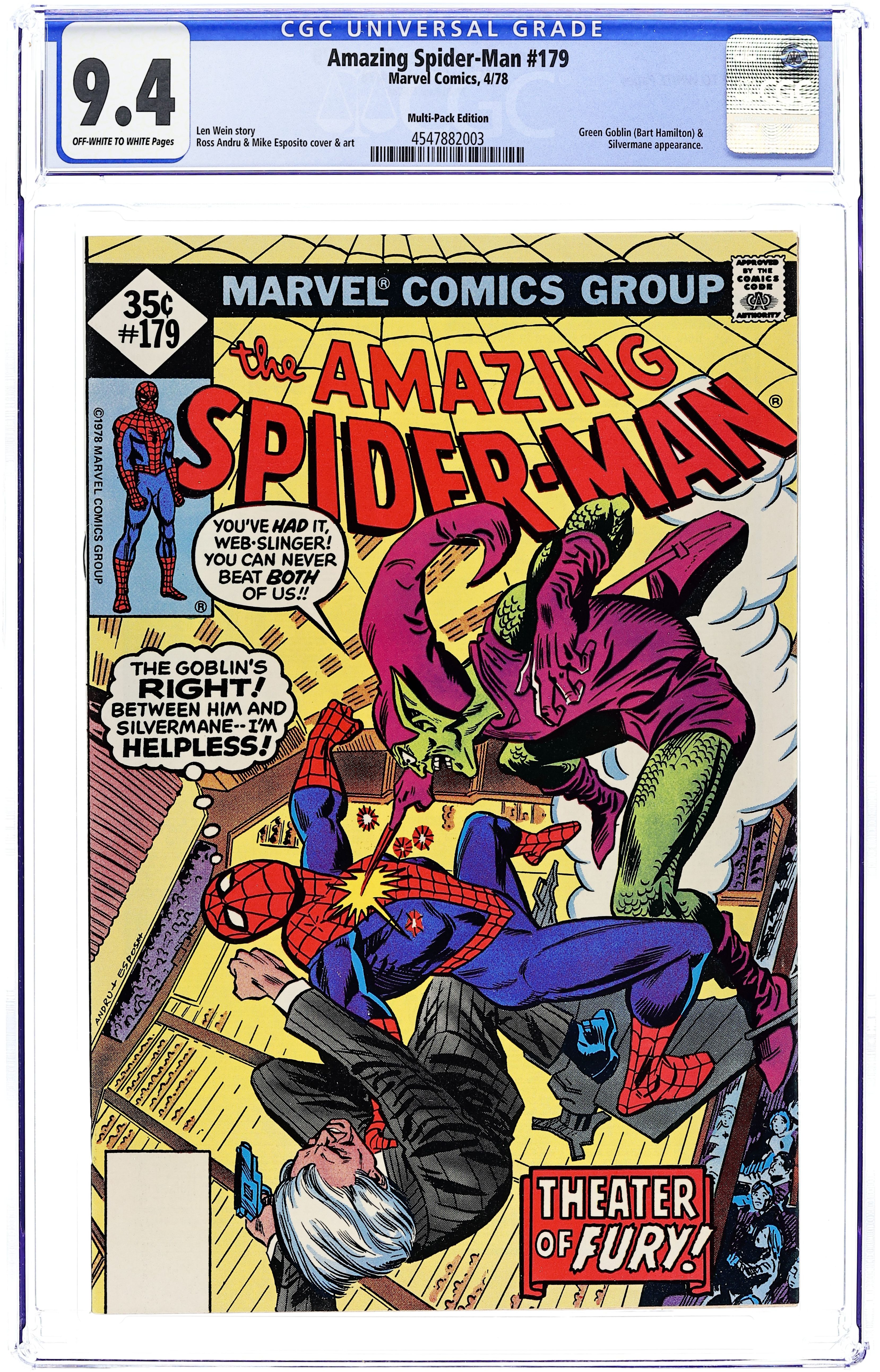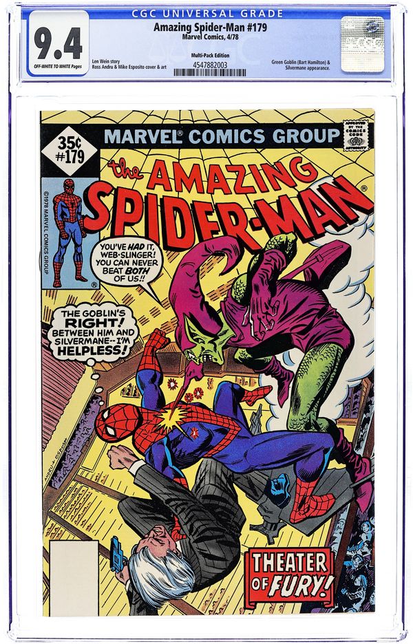 Ends Dec 8 7:23 PM CST Bid History 8 bids Current Bid $31 Your Secret Max Bid If you'd like to bid, please log in or register. Whitman Variant. "The Goblin's Always Greener!" Part 4 of 5. Script by Len Wein. Art by Ross Andru (breakdowns) and Mike Esposito (finishes). Cover by Ross Andru and Mike Esposito. In desperate fashion the web-slinger escapes from the Green Goblin's trap and makes a beeline for New Hope Hospital! Once inside Peter finally signs the consent forms to begin his aunt's surgery! While May's heart operation takes place, Joe Robertson tells Peter about a major disturbance going on at Radio City Music Hall. When the wall-crawler arrives at the Showplace of the Nation, the three-way battle erupts: the Green Goblin vs. Silvermane vs. the Amazing Spider-Man! And the winner will be determined next issue! Cameo appearances by Mary Jane Watson, Anna Watson, and Harry Osborn. 32 pages. Cover price $0.35. Grade: CGC 9.4 explanation of grade Condition: Used (collectible)