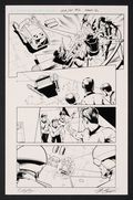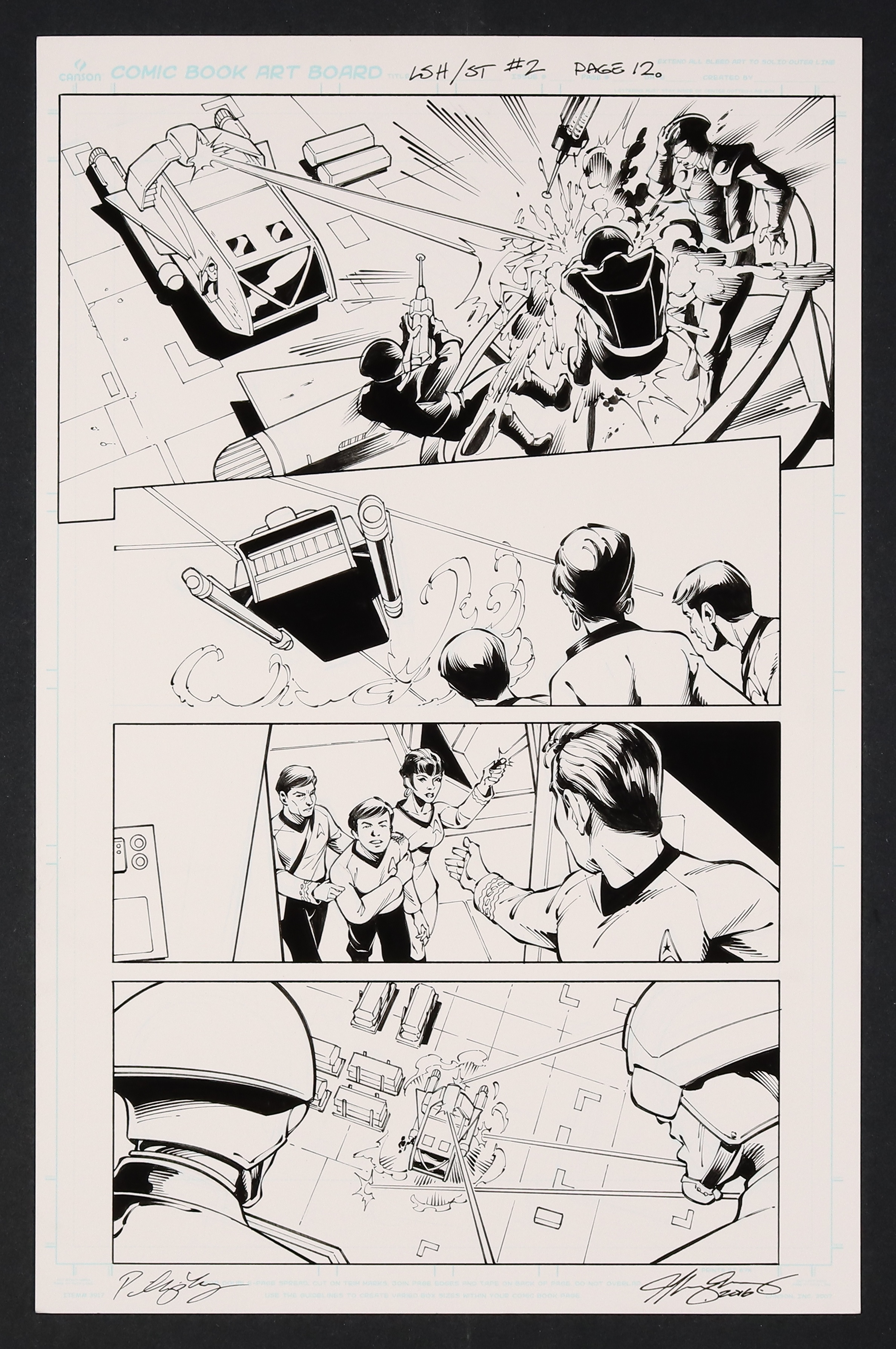 Universes collide in this epic crossover! When attempting to return to earth after their initial encounter with the Legion, the crew of the Enterprise finds it's not the earth they remember and find themselves fugitives from the governing regime. After quickly learning the shuttle's weapon controls, Kirk and Sulu rescue Bones, Scotty, and Uhura before making their escape in this great action page. Signed by the artists in lower margin. Pencil and ink on comic art board. 11" x 17".
