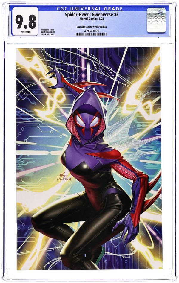 East Side Comics exclusive virgin cover by InHyuk Lee. Written by Tim Seeley. Art by Jodi Nishijima. To stop another Gwen Stacy from corrupting the world, Ghost Spider must team up with Thorgwen and travel back in time! But will this new alliance be able to stand against the Super-Soldier might of Captain America Gwen? They will have to try as it looks like she's out for revenge against ANOTHER Gwen Stacy! 28 pages, full color. Rated T+ Grade: CGC 9.8 explanation of grade Condition: Used (collectible)