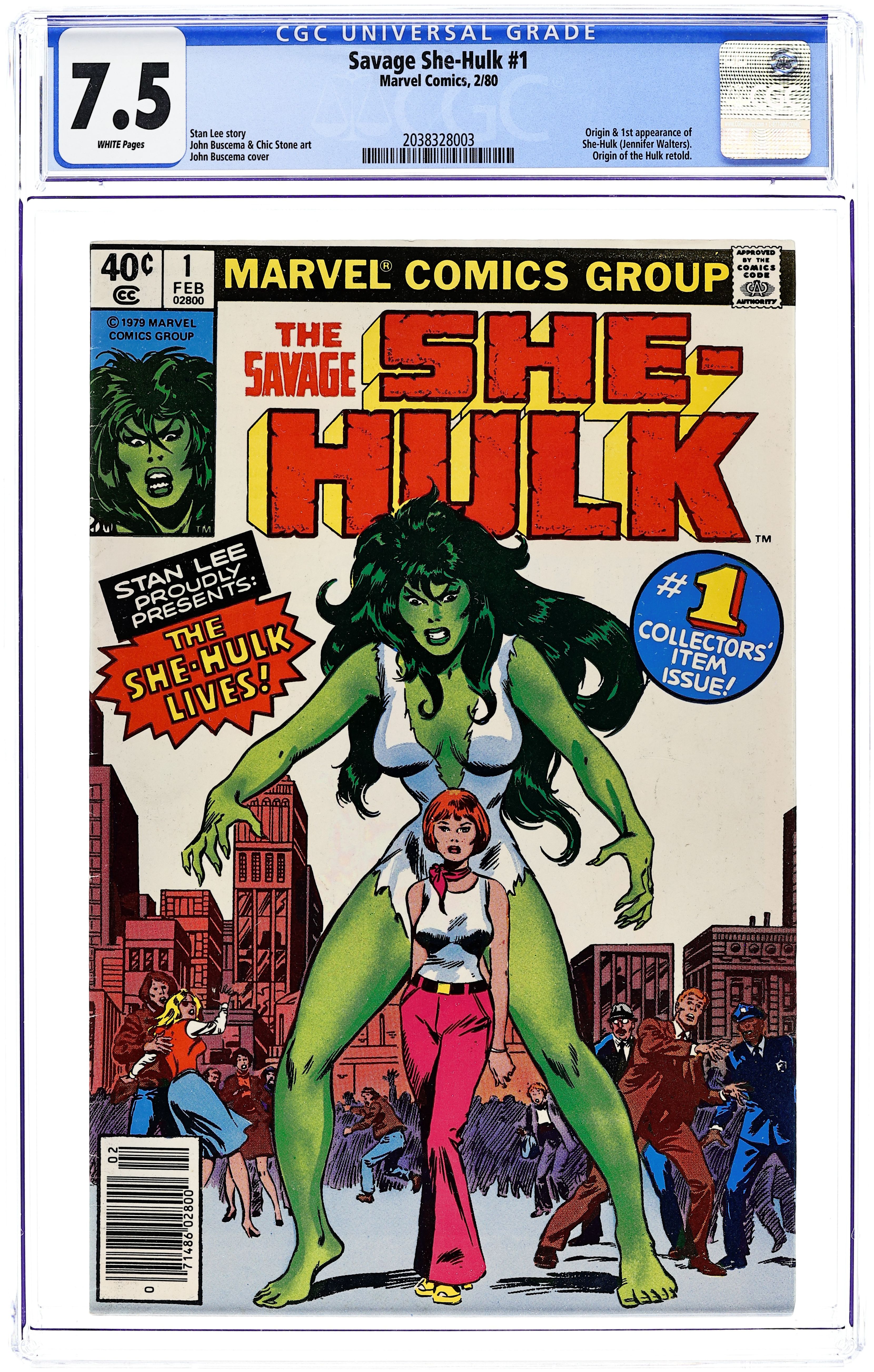 Newsstand Edition. 1st appearance and origin of the She Hulk. "The She-Hulk Lives!" Guest-starring Bruce Banner. Story by Stan Lee. Art by John Buscema and Chic Stone. Jennifer Walters is on the verge of death after an attempted assassination, and the only thing that will save her life is a blood transfusion from her cousin, Bruce Banner...AKA the Incredible Hulk! His gamma-irradiated blood sparks a startling transformation in his cousin, and she will forevermore be known as the Savage She-Hulk! Cover price $0.40. Grade: CGC 7.5 explanation of grade Condition: Used (collectible)
