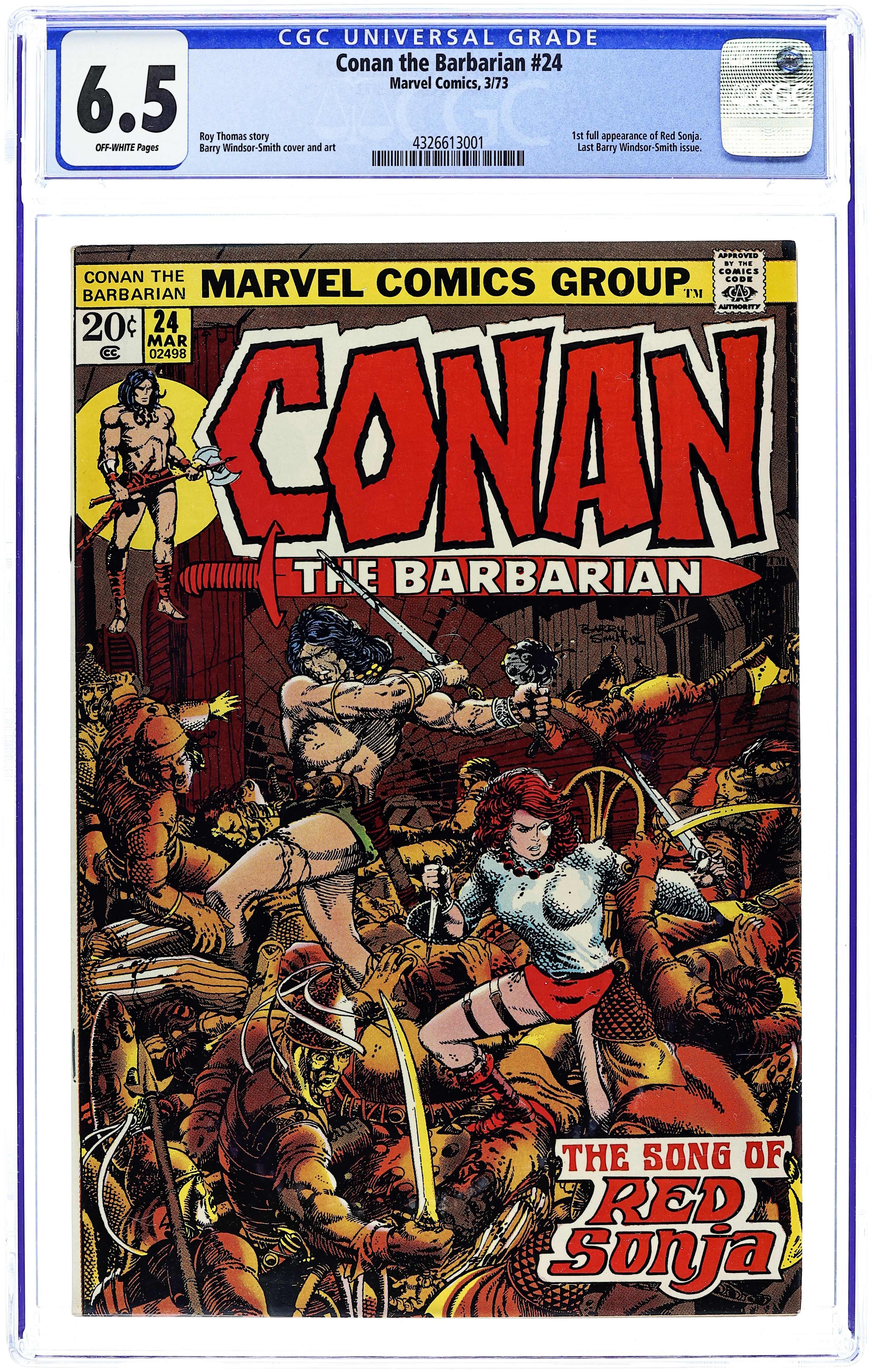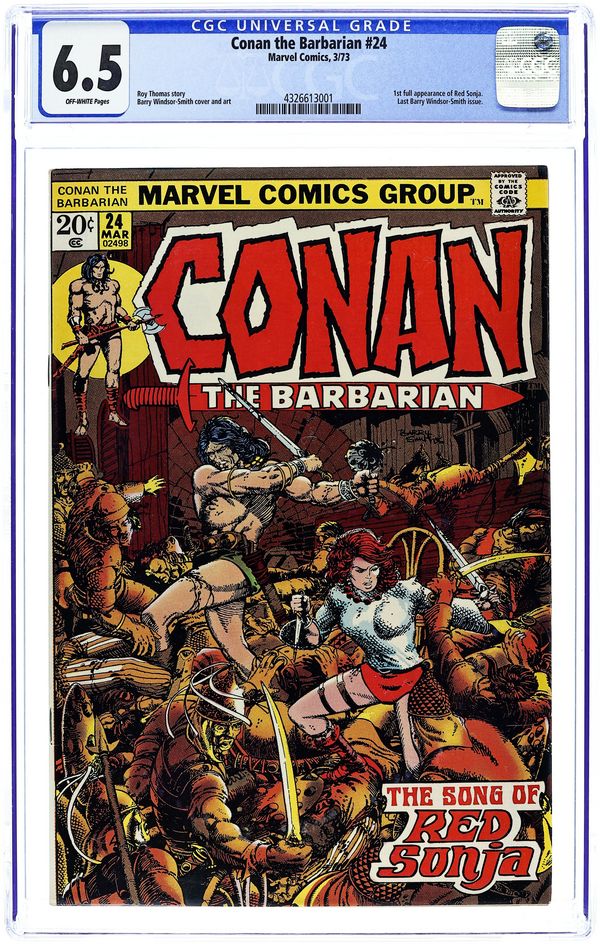 Cover art by Barry Windsor-Smith. First full Red Sonja story, The Song of Red Sonja, script by Roy Thomas, pencils by Barry Windsor-Smith; setting: Makkalet; Conan and Red Sonja start a bar-fight, bathe in a fountain, scale temple walls, break in and steal a snake-tiara, and fight a magical snake; at the end Sonja tricks Conan, and leaves for Pah-Disha; the Red Sonja story continues in Savage Sword of Conan 1. Final Windsor-Smith art on this title. The art in this issue (at least on page 8, and perhaps elsewhere) was altered without Windsor-Smith's approval. See Marvel Treasury Edition 15 or Savage Sword of Conan 82 for the original version. (The reprint in Conan Saga 8 contains the altered version). In the letter's column, Roy Thomas responds and announces Barry Smith's final departure as Conan the Barbarian artist; Incidentally, Roy's responses to R. Benitz and Keith Taylor are mistakenly transposed. 36 pgs. Cover price $0.20. Cover price $0.20. Grade: CGC 6.5 explanation of grade Condition: Used (collectible)