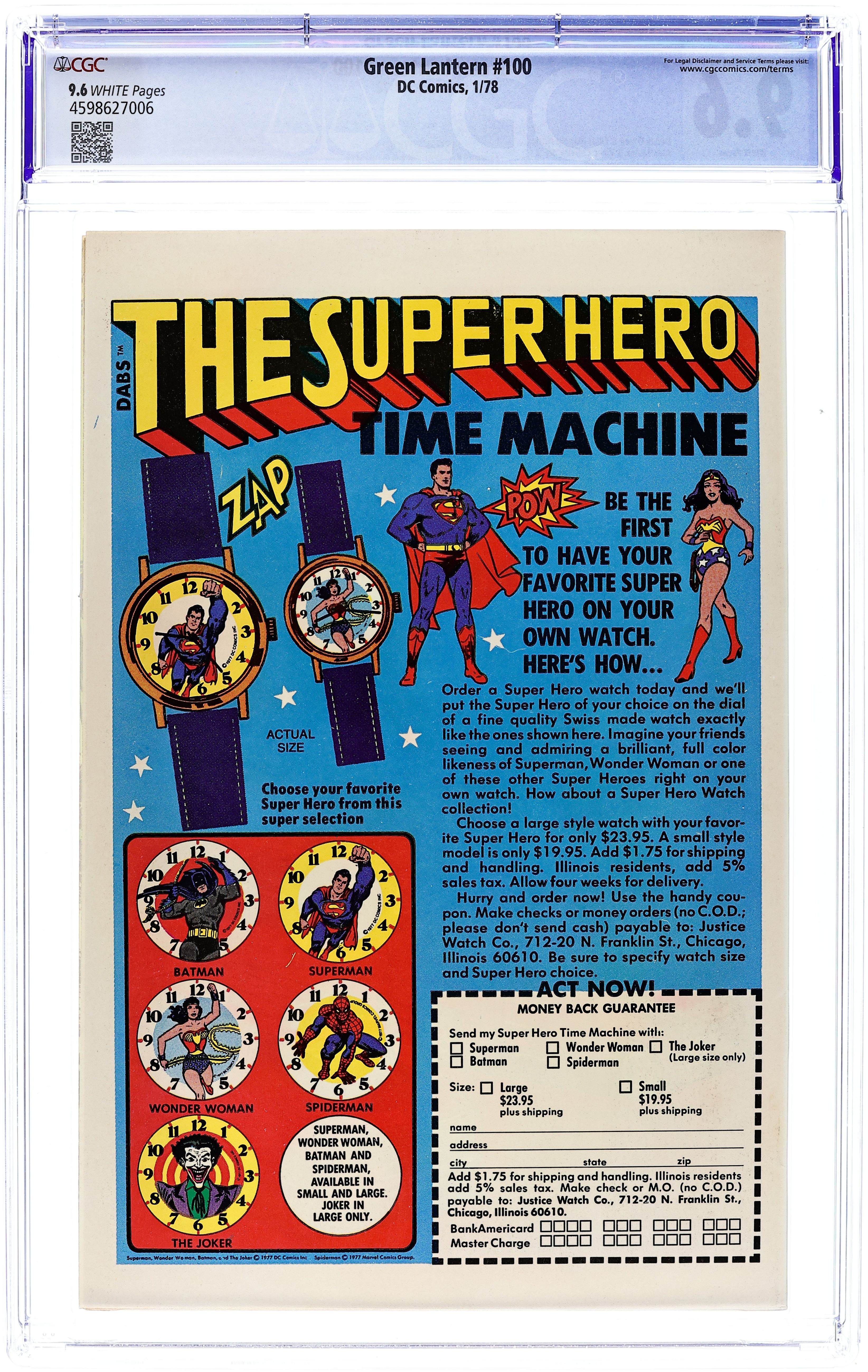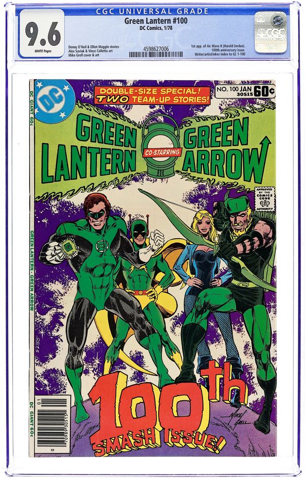 Giant-size 100th issue. "Rider of the Air Waves." Guest-starring Black Canary & Air Wave. Green Lantern and the new Air Wave take on Master-Tek, a technological terrorist. The story reveals that the original Air Wave was Hal Jordan's uncle, Larry Jordan. Script by Denny O'Neil, pencils by Alex Saviuk, inks by Vince Colletta. Cover by Mike Grell. Cover price $0.60. Grade: CGC 9.6 explanation of grade Condition: Used (collectible)