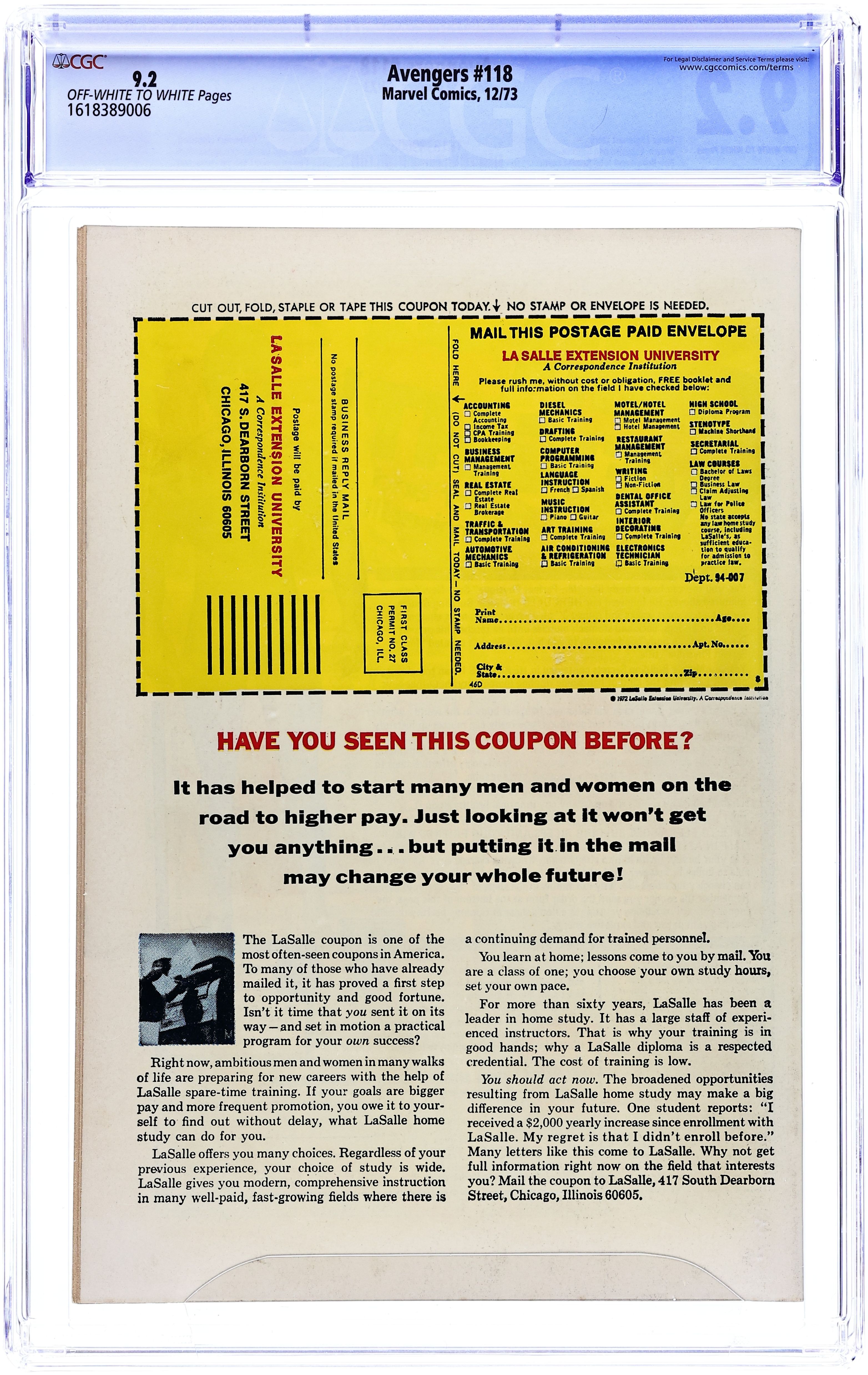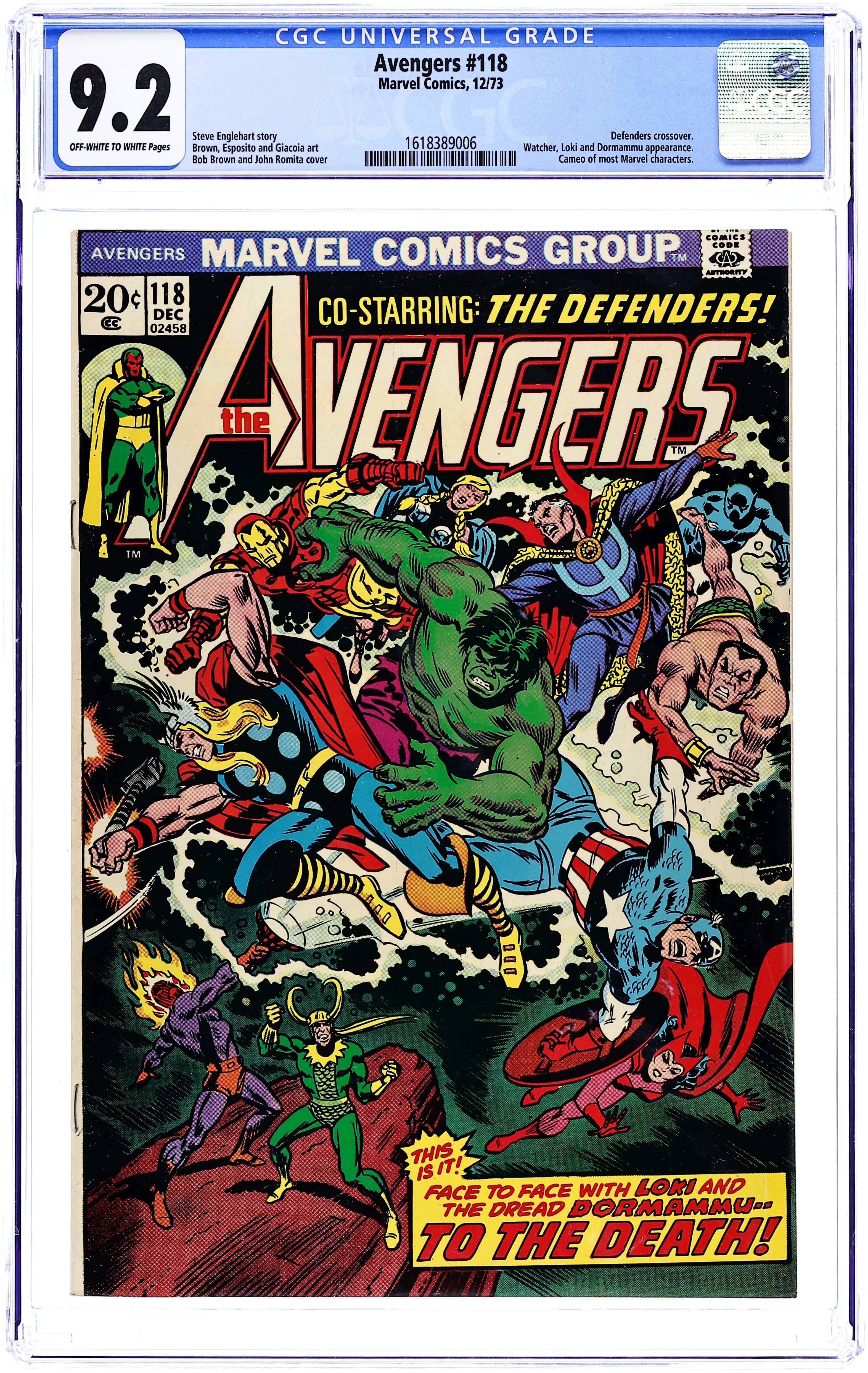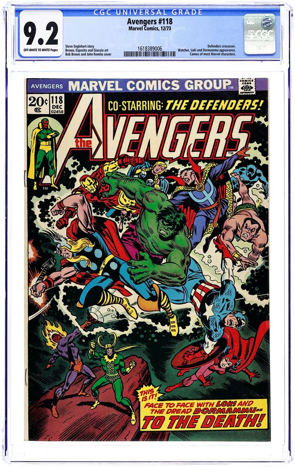"To The Death!" Avengers-Defenders crossover. Part 7 of 8. Guest-starring the Defenders. Script by Steve Englehart. Pencils by Bob Brown. Inks by Mike Esposito and Frank Giacoia. Cover by Bob Brown and John Romita. One of the classic Avengers issues of the bronze age! Story continues from Defenders 10. At last the truth stands revealed! Dormammu and Loki have tricked the Avengers and Defenders into gathering the Evil Eye! And now Dormammu has the Evil Eye and is using it to merge his dark dimension with Earth's! The fourteen super-heroes have one hour to beat the powerful super-villains before chaos envelopes the universe! Once inside the dark realm, the Dread One wipes out the Defenders! And after quicksand bogs down five avengers, only three remain to make the final charge! But when the thunder god and the golden avenger fall, the final hope of the universe rests with the Scarlet Witch! In the depths of the dark realm, can Wanda deliver the coup de grĂ¢ce to the Dread Dormammu? Avengers Assemble! Story continues in Defenders 11. Cameo appearances by Contessa Valentina Allegro, Dum Dum Dugan, Nick Fury, the Watcher, Fantastic Four, Spider-Man, Black Bolt, Gorgon, Karnak, Dracula, Ghost Rider, Luke Cage, Man-Thing, Ka-Zar, Zabu, Thanos, Adam Warlock, and Doctor Doom. (Notes: The Avengers-Defenders Clash was a masterpiece by Steve Englehart that set the standard for multi-issue crossovers (that have become much more common in the modern age). Crossover stories greater than 2 or 3 issues were very rare in the silver and bronze ages. The Avengers-Defenders Clash was reprinted in a trade paperback in 2002 and again in a hard cover edition in 2007. The Avengers appear in a cameo role in the final part of the story in Defenders 11. Dormammu returns in Doctor Strange (2nd series) 6. The letters page includes a letter from comics writer Ralph Macchio.) 36 pages Cover price $0.20. Grade: CGC 9.2 explanation of grade Condition: Used (collectible)