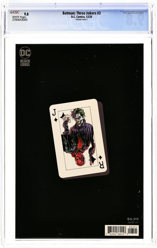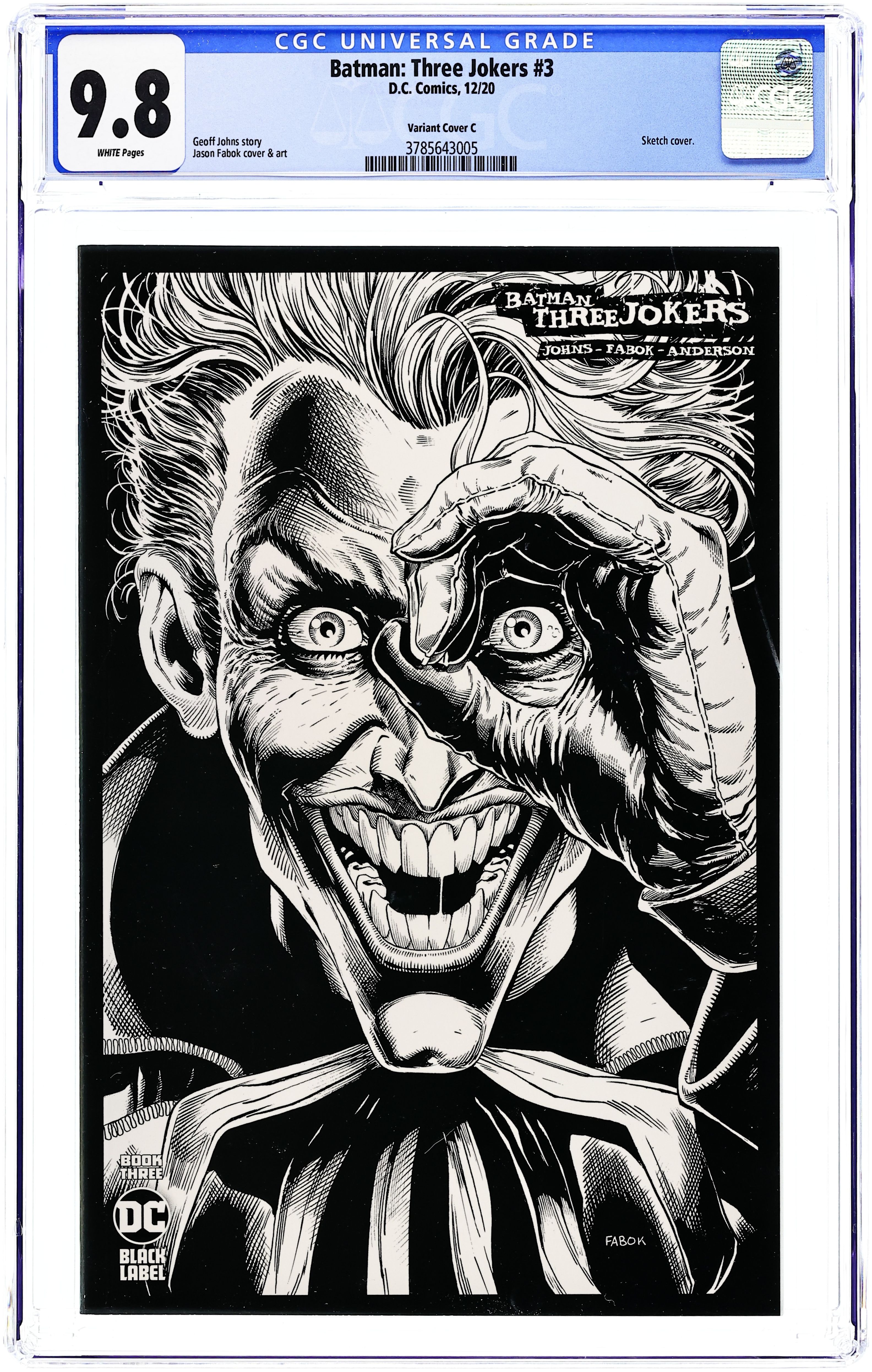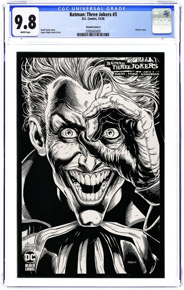 Ends Dec 8 7:42 PM CST Bid History 4 bids Current Bid $28 Your Secret Max Bid If you'd like to bid, please log in or register. Limited 1 for 100 Retailer Incentive Variant Cover. Written by Geoff Johns. Art and Cover by Jason Fabok. The final chapter of the most terrifying and personal Batman mystery is here! Still reeling from their last encounter with the three Jokers, Batman, Batgirl, and Red Hood discover the terrible truth about the Three Jokers plot. Will the caped crusaders have the strength needed to put an end to the maniacal menaces master plan once and for all, or will it be lights out for good? You wont want to miss the stunning conclusion of Batman: Three Jokers as it completes its trajectory as the ultimate examination of The Joker and his never-ending conflict with Batman. 48 pages, full color. Mature Readers Cover price $6.99. Grade: CGC 9.8 explanation of grade Condition: Used (collectible)