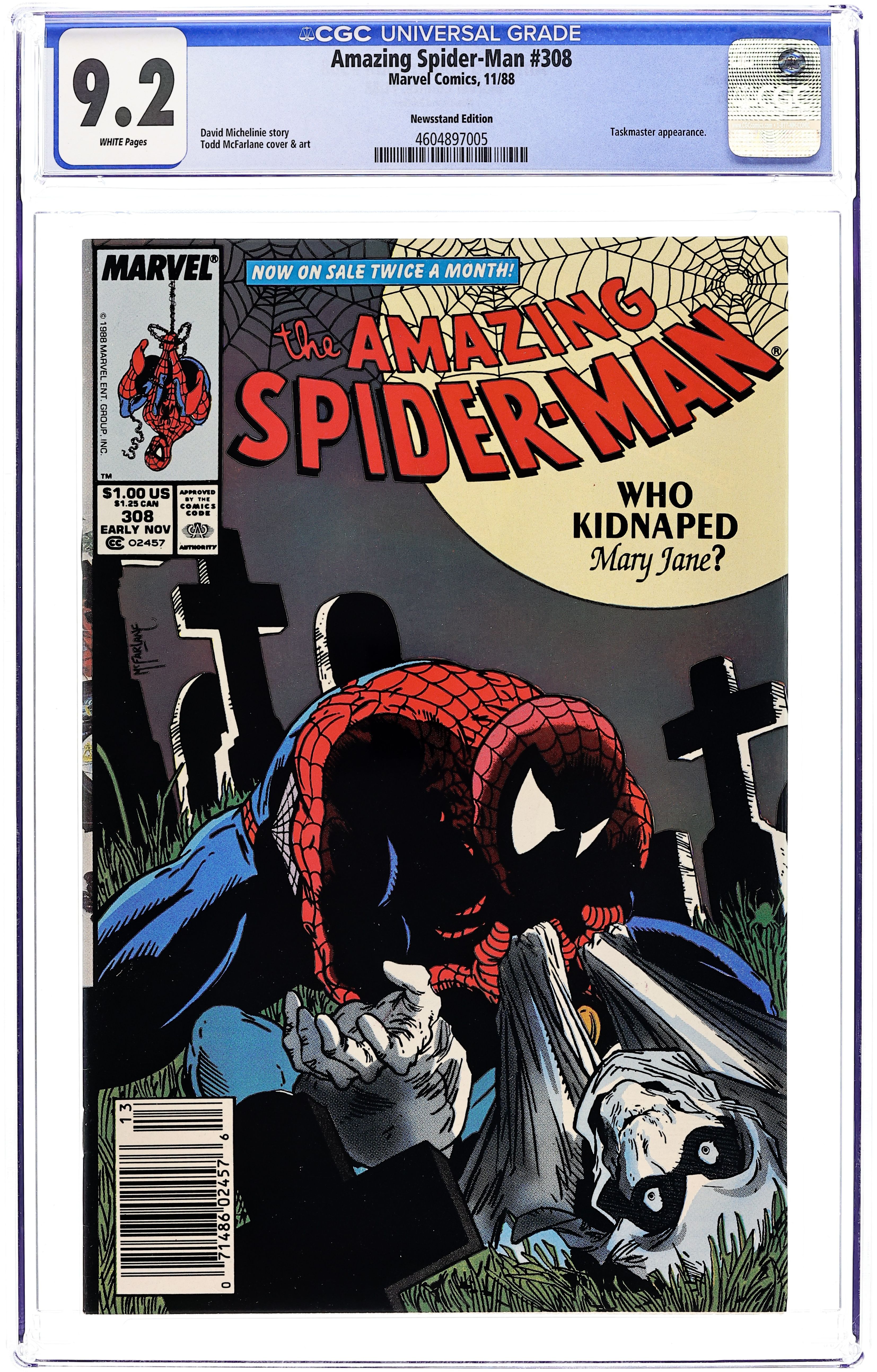 Newsstand Edition. "Dread" Part 1 of 2. Script by David Michelinie. Art by Todd McFarlane. Cover by Todd McFarlane. Mary Jane is missing! Kidnapped by her psychotic downstairs neighbor Jonathon Caesar! But her despondent husband doesn't know that! So, a fighting mad web-slinger launches a furious search across the city! An errant clue leads the wall-crawler to a rundown Brooklyn cemetery and a reunion with an old foe! Does the Taskmaster stand a chance vs. the determined Spider-Man? The crafty villain is in the wrong place at the wrong time tonight! Cameo appearances by Aunt May, Sergeant Tork, and the Black Cat. (Note: Spider-Man previously clashed with the Taskmaster in Marvel Team-Up 103.) 36 pages Cover price $1.00. Grade: CGC 9.2 explanation of grade Condition: Used (collectible)