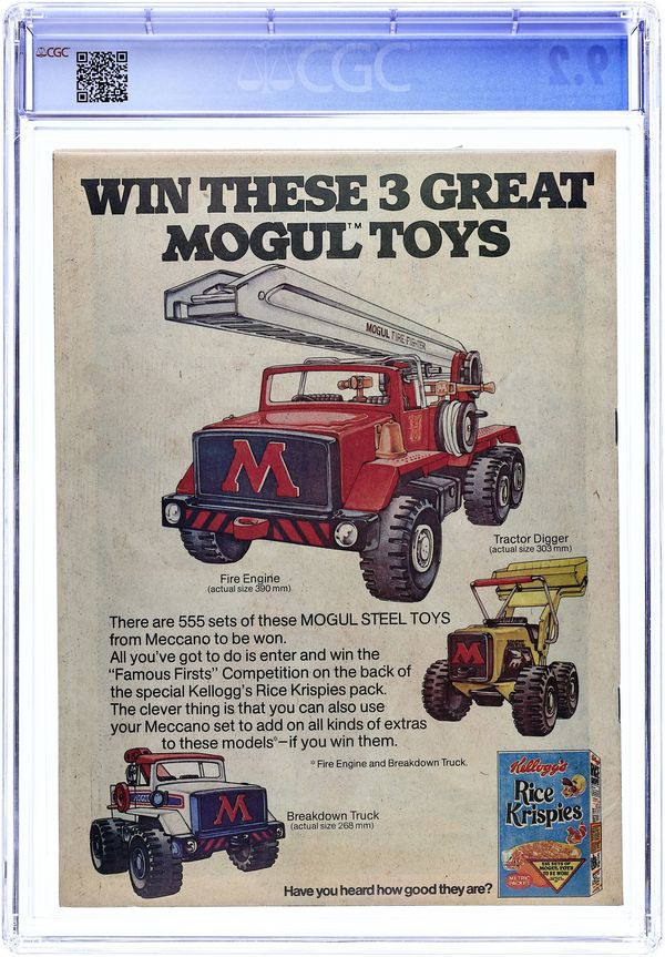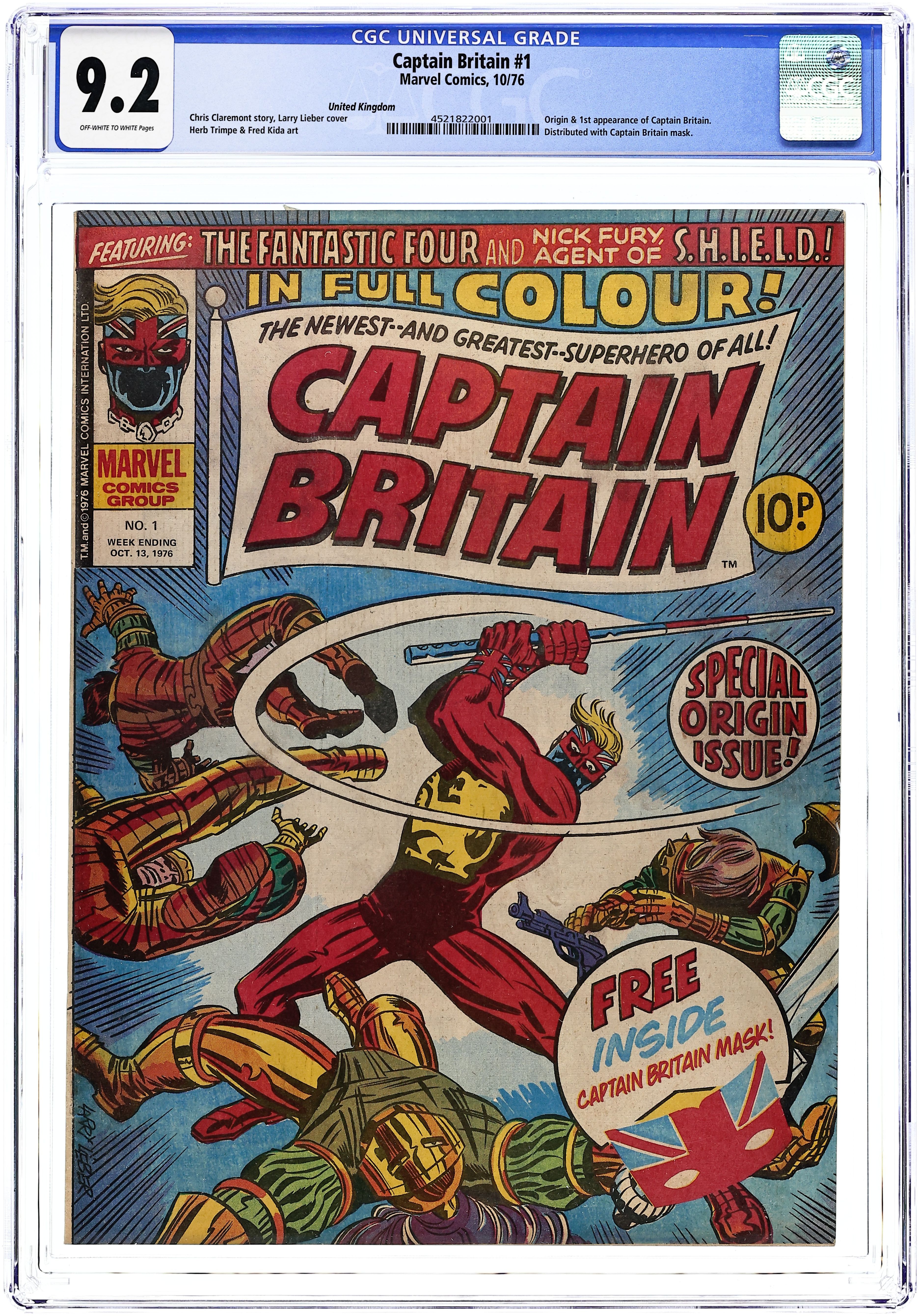Copy includes Captain Britain mask. Magazine size weekly British edition comic published weekly by Marvel Comics International. First issue features origin of the Mask. Fantastic Four #110 reprint in b&w. Nick Fury reprint. Nick Fury Pinup Page/Captain Britain Pinup page; 32 pages; cover and 13 interior pages in full color, rest black and white. Grade: CGC 9.2 explanation of grade Condition: Used (collectible)