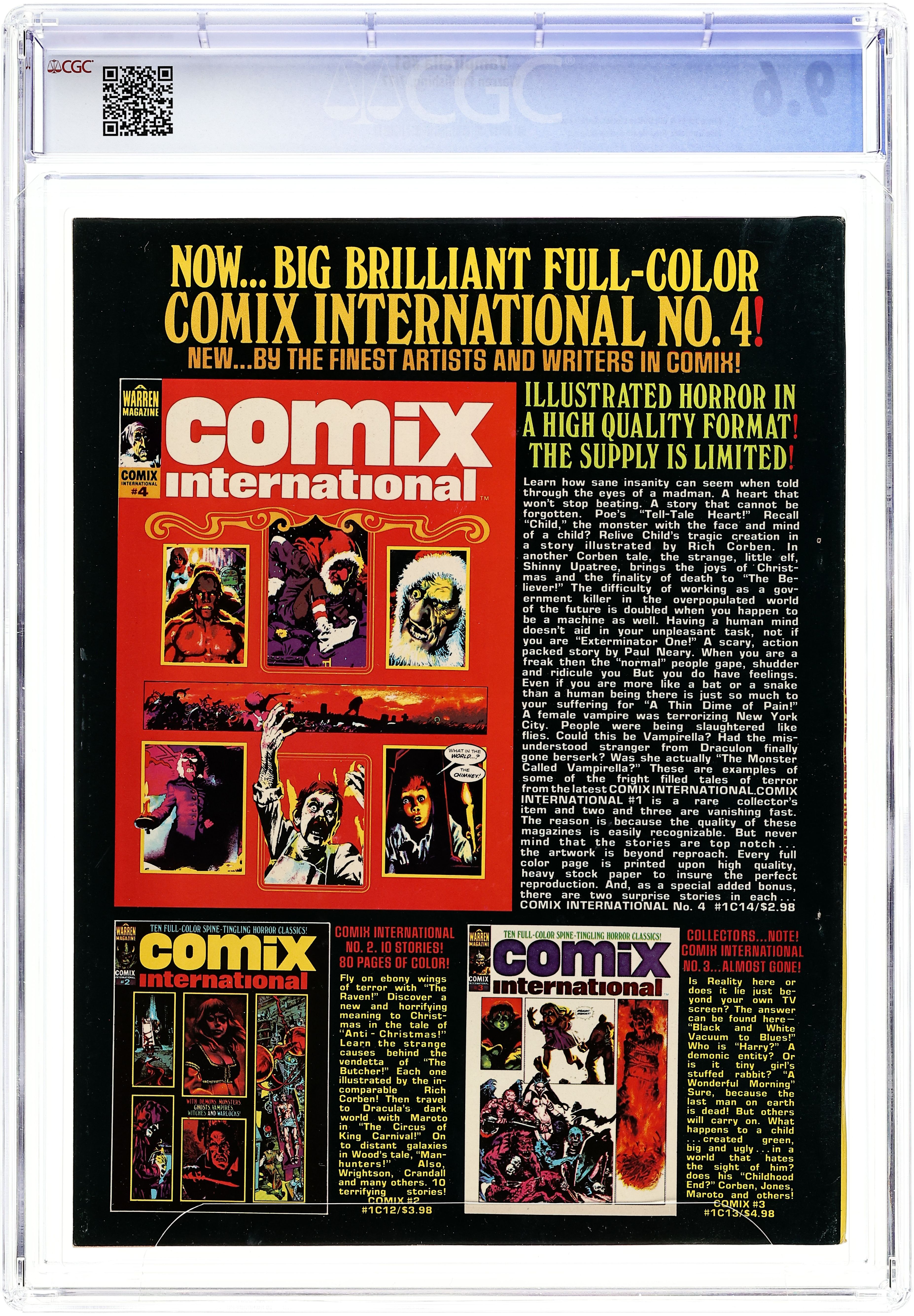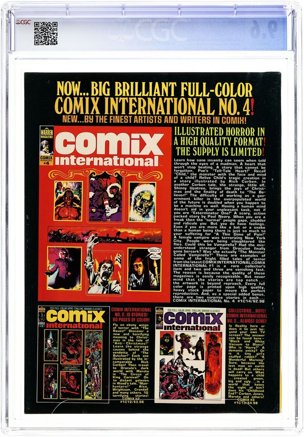 Stories in this issue include: "Vampi: An Eye for an Eye"; "Skimpole's Monsters"; "Brother Hawk"; "Thistlewhite the Bold"; and "Companions to the Sun." Written by Nicola Cuti, Bill DuBay, and Bruce Jones. Art by Jose Gonzalez, Russ Heath, Carmine Infantino, Alex Nino, Leopold Sanchez, and Ramon Torrents. This installment of Joe Brancatelli's column on comic books is about the Comics Code. Inside cover features an ad for the now rare Vampirella paperback novels. Cover art by Enrich Torres. Cover price $1.25. Grade: CGC 9.6 explanation of grade Condition: Used (collectible)