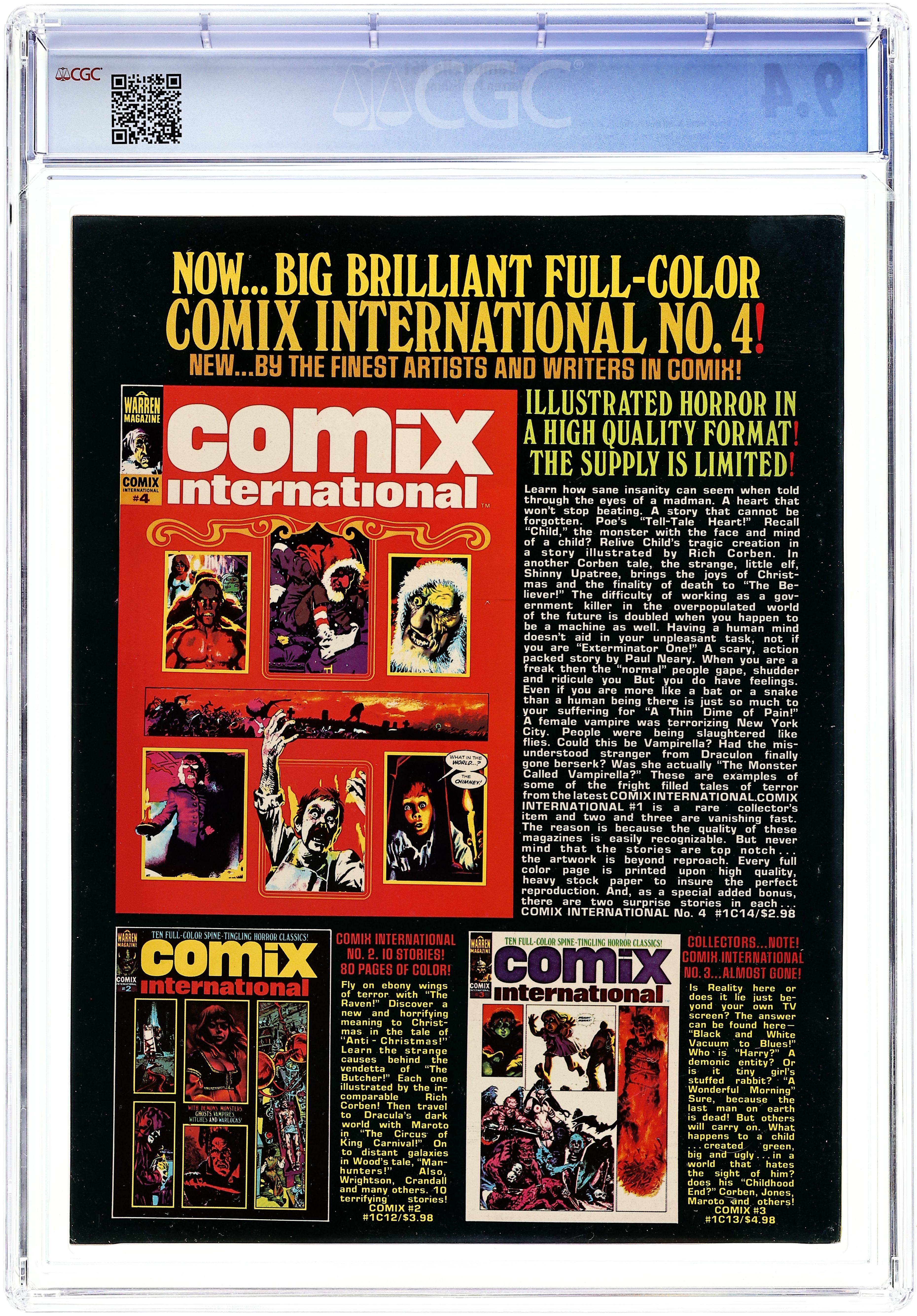 Stories in this issue include: "Vampi: An Eye for an Eye"; "Skimpole's Monsters"; "Brother Hawk"; "Thistlewhite the Bold"; and "Companions to the Sun." Written by Nicola Cuti, Bill DuBay, and Bruce Jones. Art by Jose Gonzalez, Russ Heath, Carmine Infantino, Alex Nino, Leopold Sanchez, and Ramon Torrents. This installment of Joe Brancatelli's column on comic books is about the Comics Code. Inside cover features an ad for the now rare Vampirella paperback novels. Cover art by Enrich Torres. Cover price $1.25. Grade: CGC 9.4 explanation of grade Condition: Used (collectible)