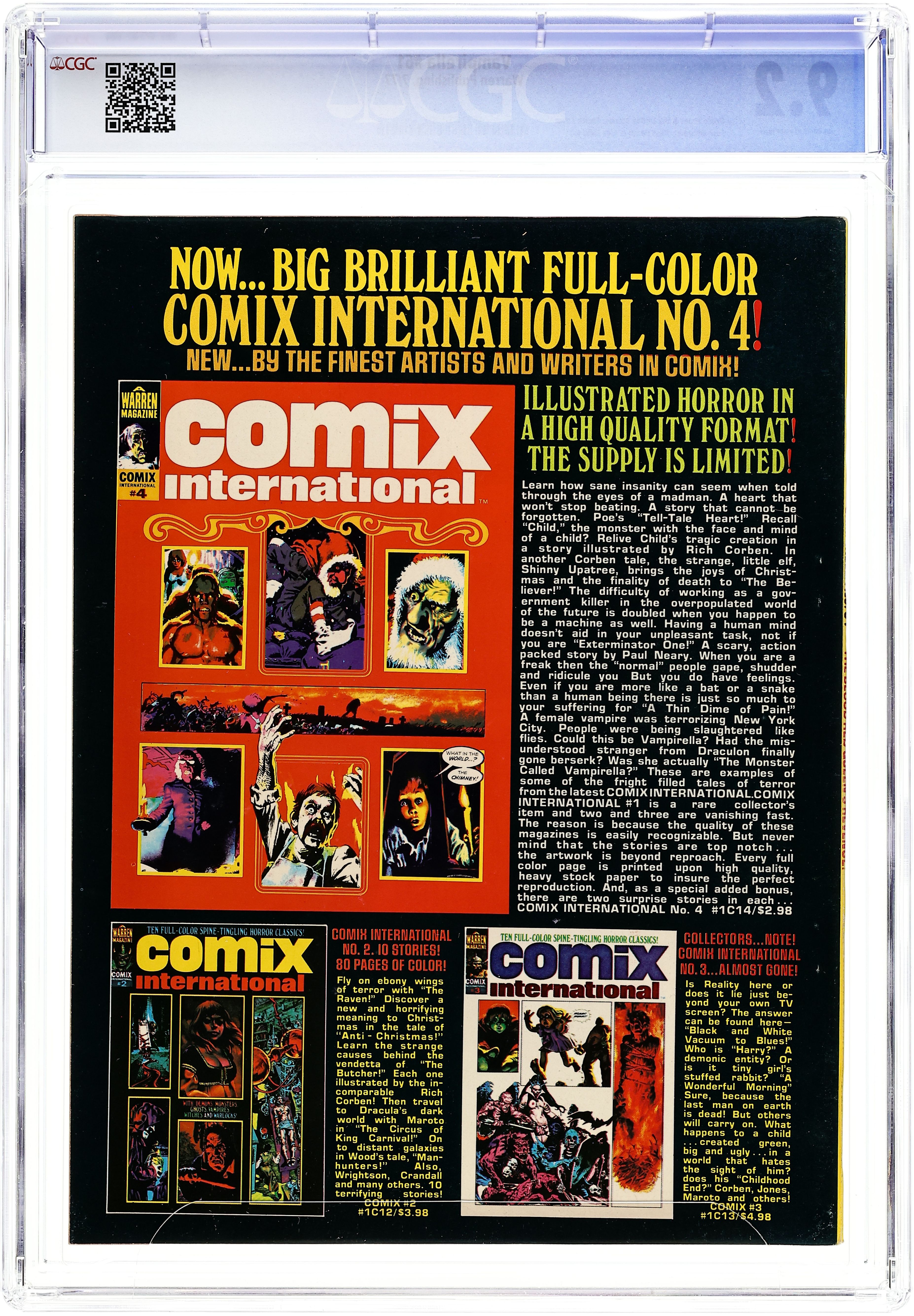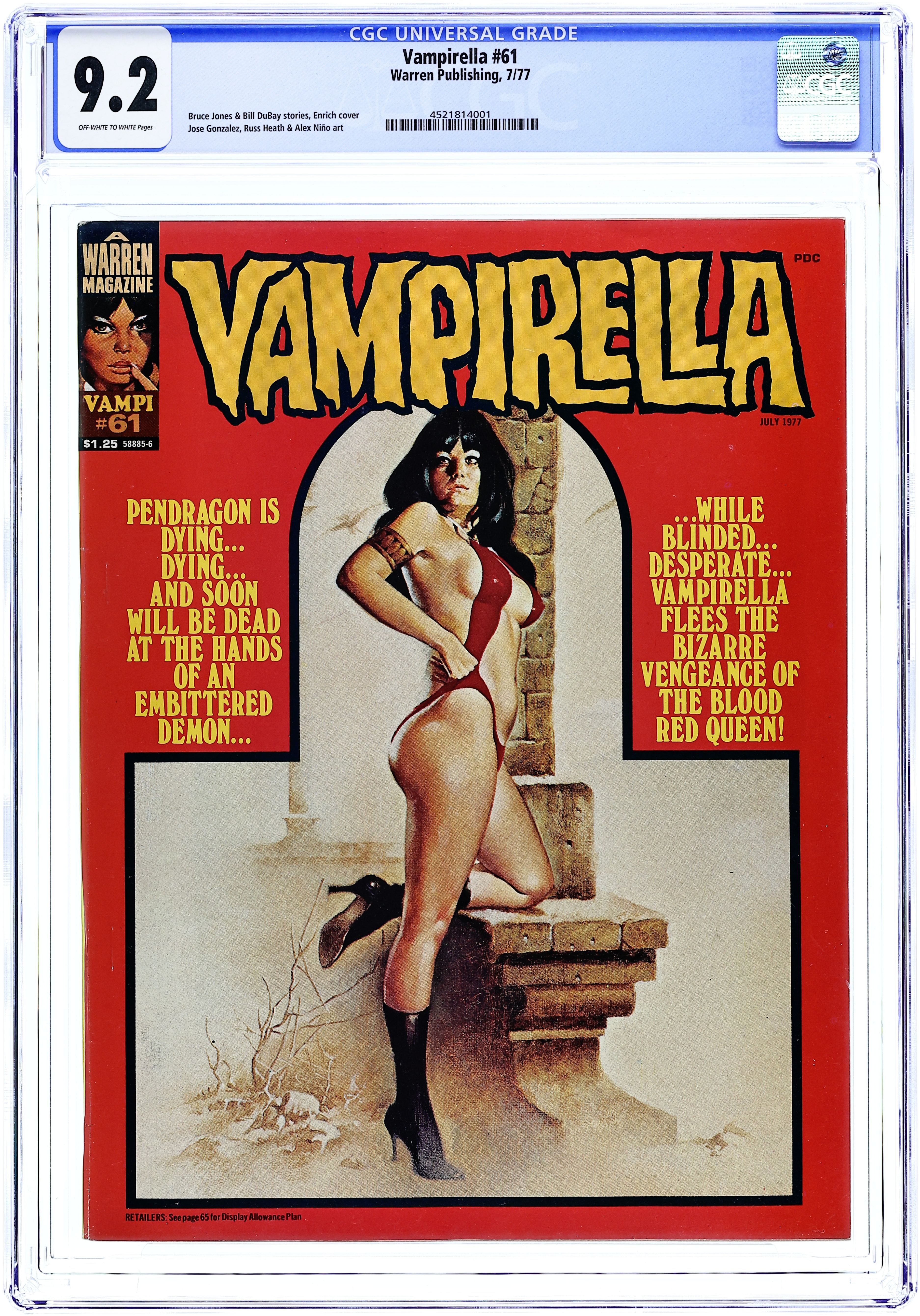 Stories in this issue include: "Vampi: An Eye for an Eye"; "Skimpole's Monsters"; "Brother Hawk"; "Thistlewhite the Bold"; and "Companions to the Sun." Written by Nicola Cuti, Bill DuBay, and Bruce Jones. Art by Jose Gonzalez, Russ Heath, Carmine Infantino, Alex Nino, Leopold Sanchez, and Ramon Torrents. This installment of Joe Brancatelli's column on comic books is about the Comics Code. Inside cover features an ad for the now rare Vampirella paperback novels. Cover art by Enrich Torres. Cover price $1.25. Grade: CGC 9.2 explanation of grade Condition: Used (collectible)