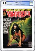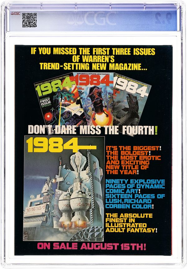 This issue features a full-length Vampirella story (called "A Gathering of Demons") in which the hellacious hottie "Confronts a gathering of demons to rescue Earth from Lucifer's savage legions." Written by Bill DuBay, with art by Gonzalo Mayo. Joe Brancatelli's column on comic books discusses the effects of copyright laws on the industry. Cover art by Bob Larkin. Cover price $1.25. Grade: CGC 9.2 explanation of grade Condition: Used (collectible)