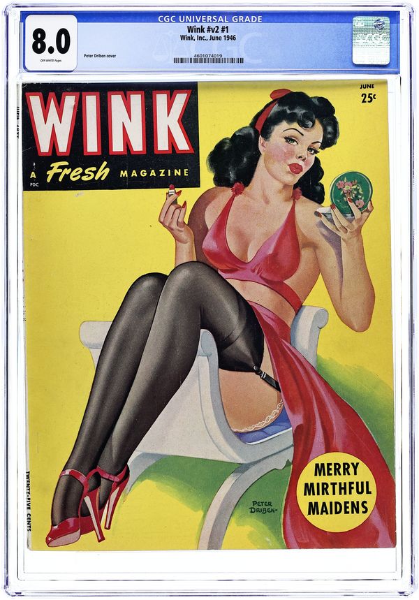 Volume 2, Issue 1 - June, 1946. Painted cover by Peter Driben. Vintage men's interest magazine focused on lingerie pin-up pictorials. 8.5" x 11", 64 pages, B&W. -MATURE READERS- Cover price $0.25. Grade: CGC 8.0 explanation of grade Condition: Used (collectible)