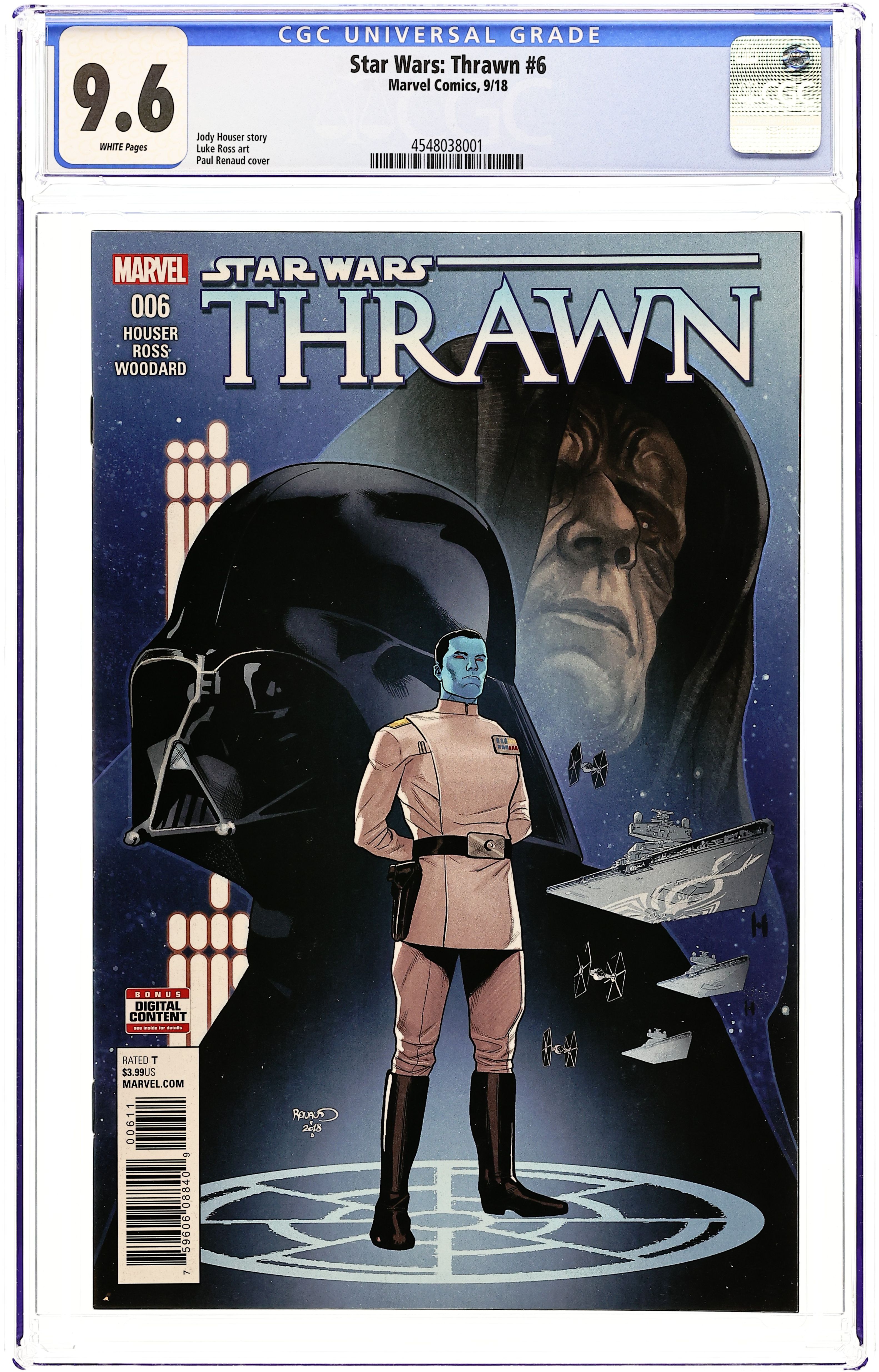 Written by Jody Houser. Art by Luke Ross. Cover by Paul Renaud. THE RISE OF THE GRAND ADMIRAL REACHES ITS CLIMAX! THRAWN at last meets his greatest enemy face-to-face! Will PRYCE's final gambit to save her family succeed? And what role will ELI VANTO play in Thrawn's ultimate plan? 28 pages, full color. Rated T Cover price $3.99. Grade: CGC 9.6 explanation of grade Condition: Used (collectible)