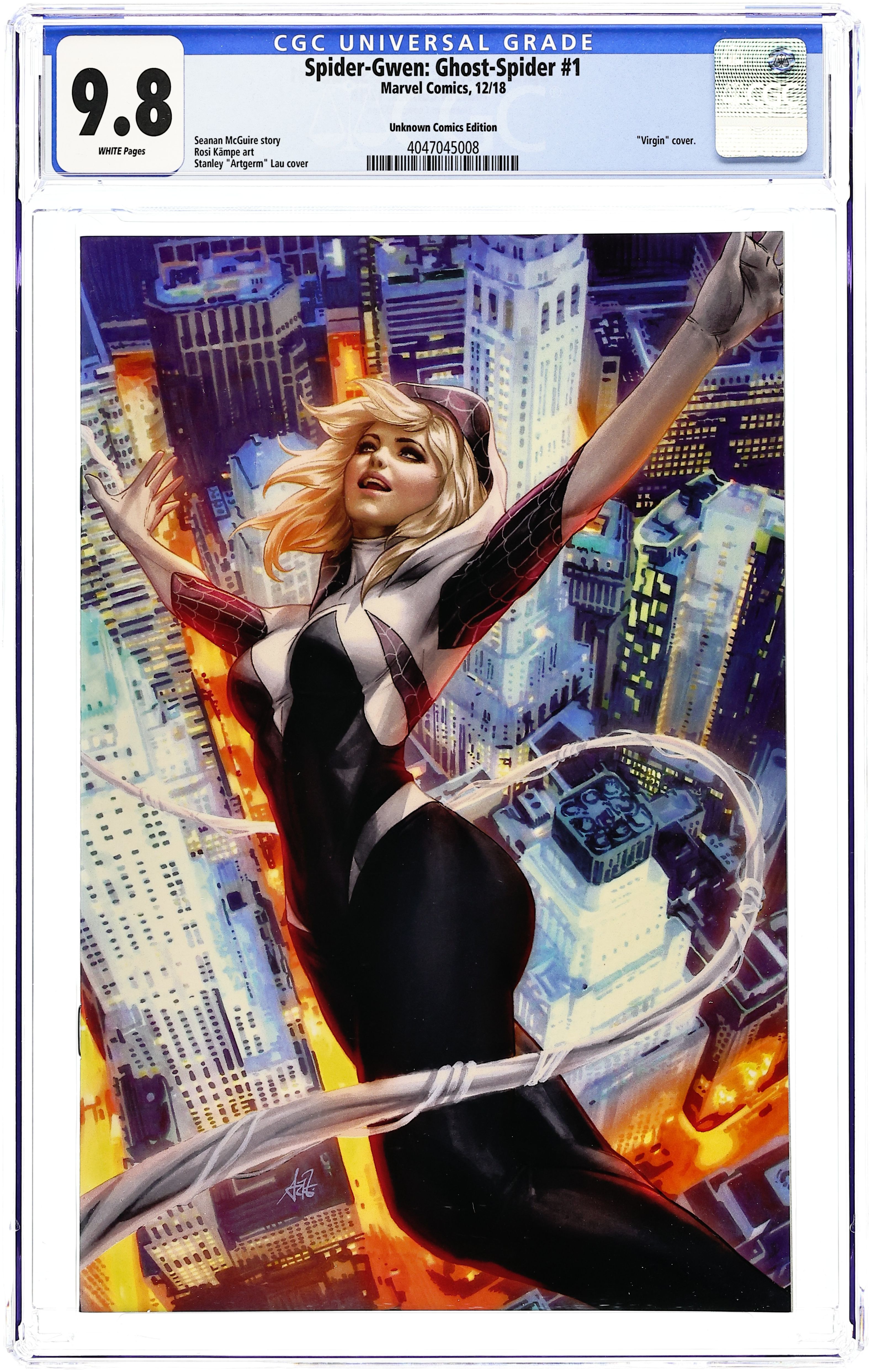 Unknown Comics variant cover by Stanley "Artgerm" Lau. Written by Seanan McGuire. Art by Rosi Kampe. Cover by Bengal. A SPIDER-GEDDON TIE IN! What? You thought we were done with Gwen Stacy after the first two landmark volumes of her series?! GET OUTTA HERE. It's a whole new spin on Gwen and her world of Earth-65, brought to you by none other than SEANAN MCGUIRE & ROSI KÄMPE! We pick up with Gwen right where we left her - fighting crime through her home reality, unaware that it sits on the precipice of interdimensional calamity! Someone's gonna be late to band practice. 28 pages, full color. Rated T+ Grade: CGC 9.8 explanation of grade Condition: Used (collectible)