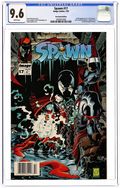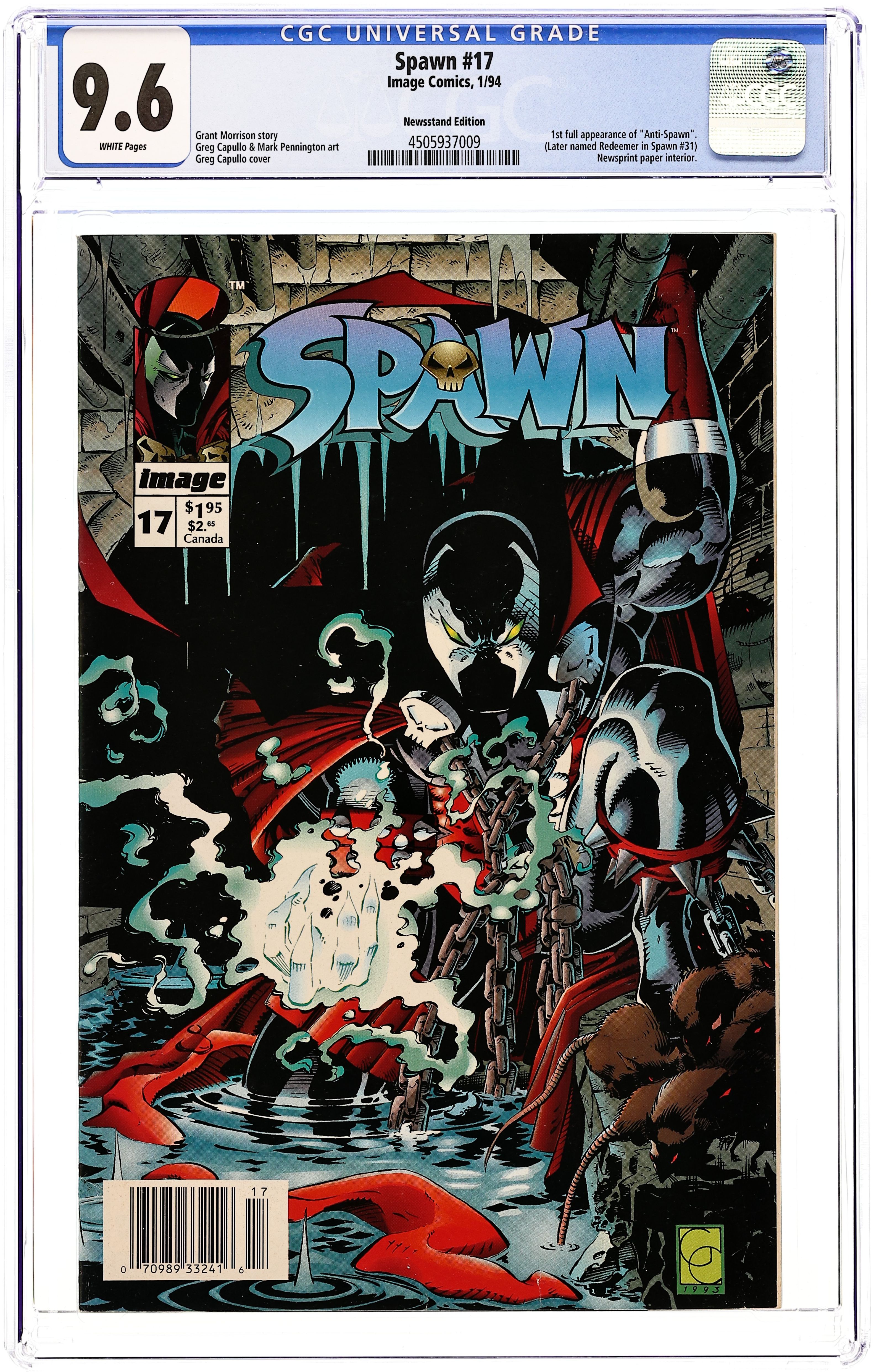 Newsstand Edition. Story by Grant Morrison. Art by Greg Capullo and Mark Pennington. "Reflections!" Part 2 of 3. Spawn was created to be warrior for the armies of hell in the final battle against Heaven. He possesses unimaginable, but finite, power and he has yet to meet his match. Until now. Spawn must battle the Anti-Spawn, a transformed Jason Wynn and instrument of Heaven whose powers rival his own. Includes a 2-page pin-up featuring Spawn vs. Violator. Cover price $1.95. Grade: CGC 9.6 explanation of grade Condition: Used (collectible)