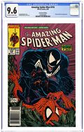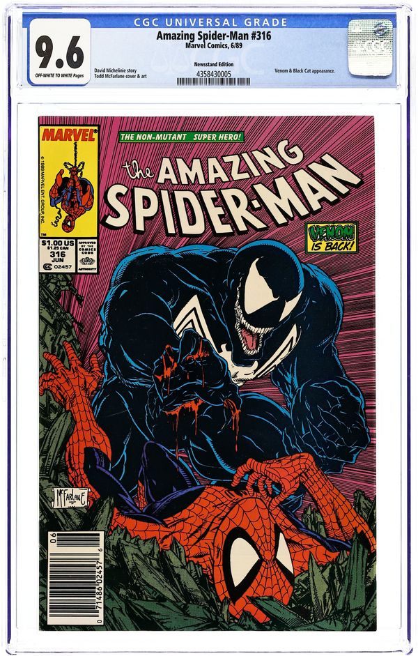 Newsstand Edition. "Dead Meat" Part 1 of 2. Script by David Michelinie. Art by Todd McFarlane. Cover by Todd McFarlane. Venom is back in New York City! And the deranged Eddie Brock is looking to kill Peter Parker or Spider-Man with extreme prejudice! However first the psychotic symbiote has to find where the Parkers are living! At the web-slinger's former Bedford Towers residence, Venom runs into and then runs roughshod over the Black Cat! But Felicia doesn't know where the wall-crawler is either! Later on Peter learns that his worst nightmare has returned and his family is in grave danger. Spider-Man can't wait for Venom to make the first move. The web-slinger must attack! Cameo appearances by Aunt May, Glory Grant, and Eduardo Lobo. (Note: This two-part story was reprinted in 1990 in the trade paperback: Spider-Man vs. Venom.) 36 pages. Cover price $1.00. Grade: CGC 9.6 explanation of grade Condition: Used (collectible)