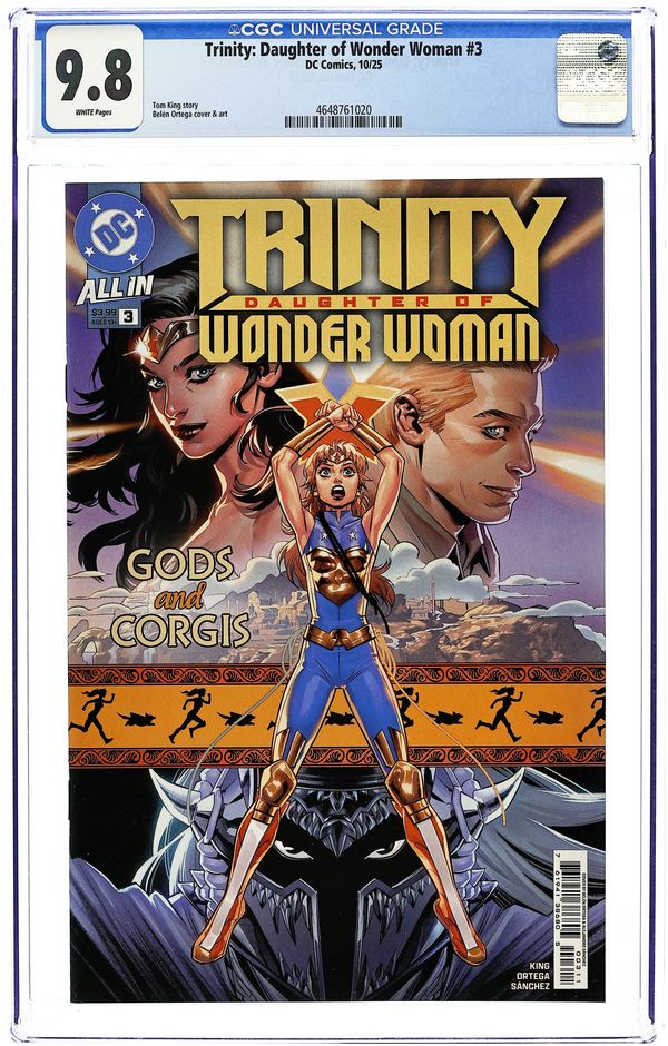 Ends Dec 8 9:49 PM CST Bid History 4 bids Current Bid $5 Your Secret Max Bid If you'd like to bid, please log in or register. Written by Tom King. Art by Belen Ortega. Cover by Belen Ortega. THIRD TIME'S THE CHARM? If at first you don't succeed, try, try again! Trinity is about to learn this lesson firsthand after a disastrous meeting with her mother in the past that leads to death at the paws of the fearsome Cerberus. Will our hero have what it takes to learn from her mistakes and save her Wonder Woman and one of the missing corgis? 28 pages, full color. Rated T+ Cover price $3.99. Grade: CGC 9.8 explanation of grade Condition: Used (collectible) unless item is a new release