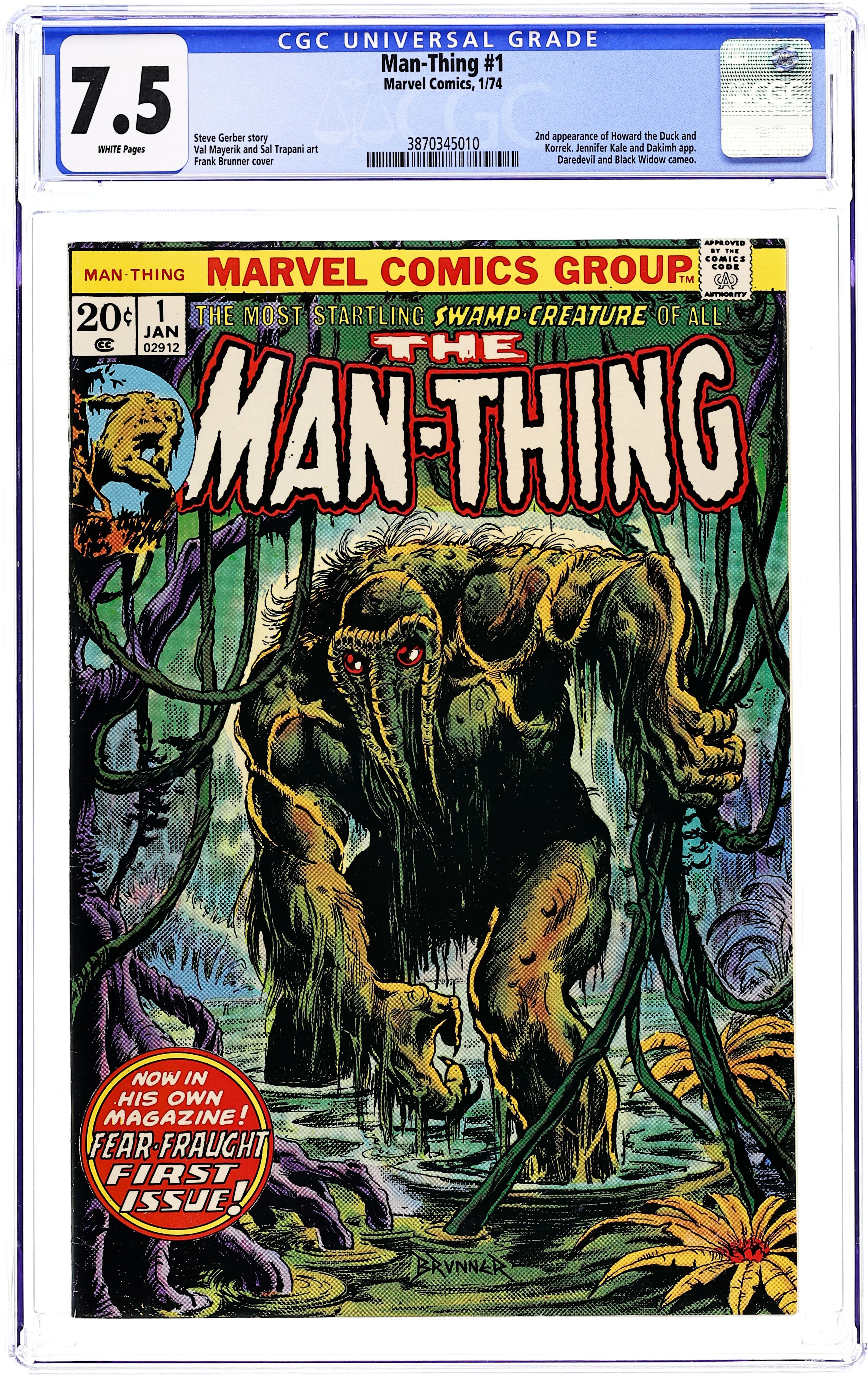 Ends Dec 8 8:49 PM CST Bid History 5 bids Current Bid $30 Your Secret Max Bid If you'd like to bid, please log in or register. "Battle for the Palace of the Gods!" Written by Steve Gerber. Art by Val Mayerik and Sal Tarpani. Cover by Frank Brunner. Now in its own magazine - the macabre Man-Thing, the most startling sawmp-creature of all! 32 pages, FC. NOTE: 2nd appearance of Howard the Duck. Cover price $0.20. Grade: CGC 7.5 explanation of grade Condition: Used (collectible)