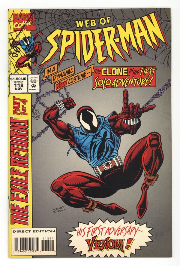 First Printing. Direct Edition. "Exiles Return Part 1 of 4: Memories" Written by Terry Kavanagh. Pencils by Steve Butle. Inks by Randy Emberlin. Venom and Clone appear. Note: First appearance of Ben Reilly as the Scarlet Spider. Cover price $1.50. Grade: FN+ 6.5 explanation of grade Condition: Used (collectible)