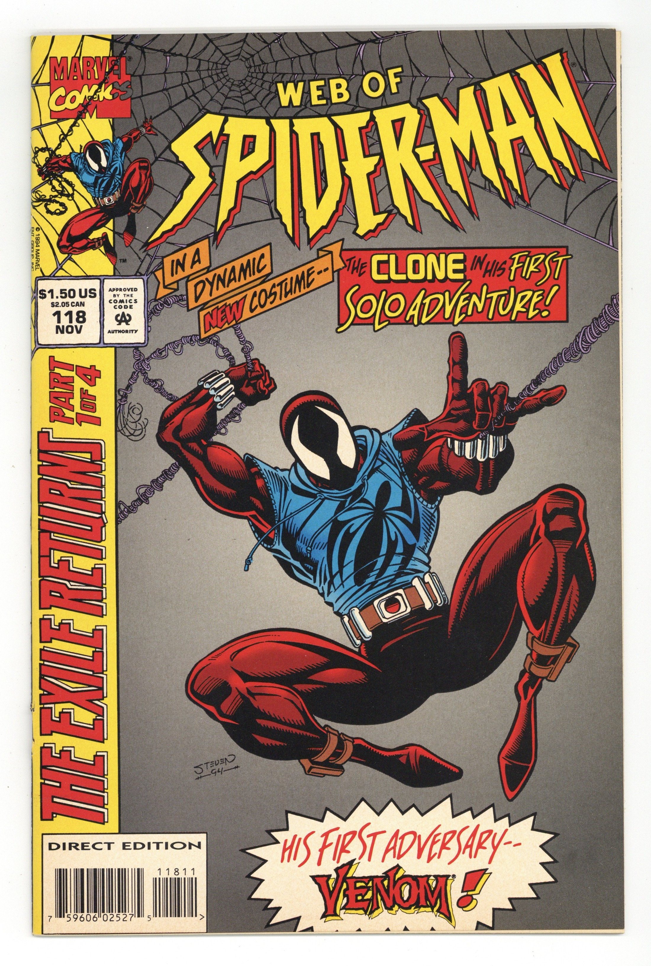 First Printing. Direct Edition. First appearance of the Scarlet Spider (aka Ben Reilly) in The Exile Returns Part 1 of 4. "Memories" Guest-starring Venom. Script by Terry Kavanagh. Art by Steven Butler (breakdowns) and Randy Emberlin (finishes). Cover by Steven Butler. Plot continues from Spectacular Spider-Man 217. Ben Reilly (aka the Spider-Clone) wanders around Manhattan trying to bury the memories of his (and Peter Parker's) past. However Ben knows that with great power comes great responsibility. So he crafts a different -- yet similar -- superhero identity to fight crime. Meanwhile, Venom is back in town and wreaking havoc on the Upper East Side. But the Scarlet Spider vows to stop him! Story continues in Spider-Man (1990) #52. Cameo appearances by Aunt May, Anna Watson, Betty Brant, and Ken Ellis. 32 pages. Cover price $1.50. Grade: FN 6.0 explanation of grade Condition: Used (collectible)