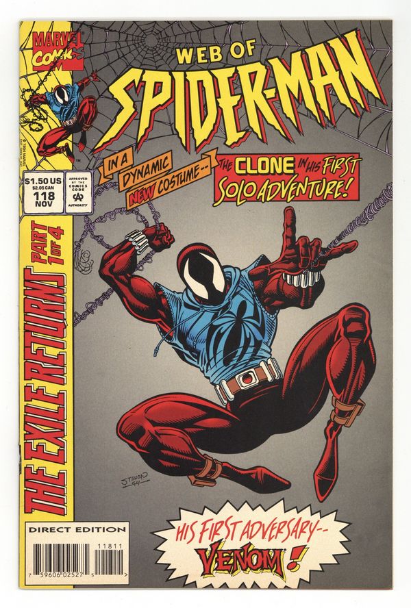 First Printing. Direct Edition. "Exiles Return Part 1 of 4: Memories" Written by Terry Kavanagh. Pencils by Steve Butle. Inks by Randy Emberlin. Venom and Clone appear. Note: First appearance of Ben Reilly as the Scarlet Spider. Cover price $1.50. Grade: FN- 5.5 explanation of grade Condition: Used (collectible)
