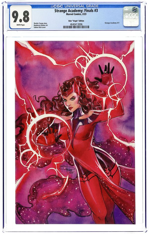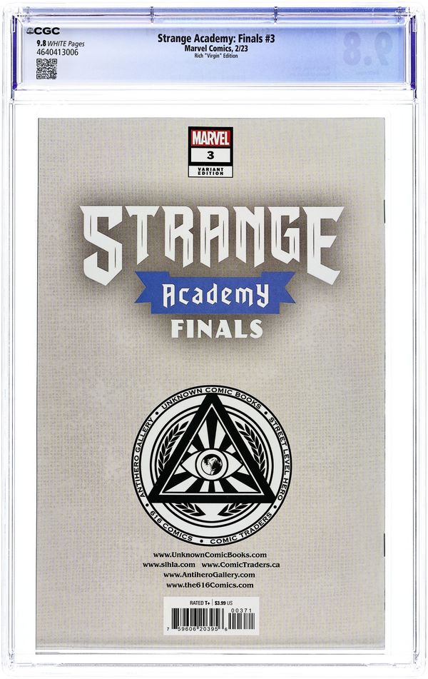 Comics Illuminati (Unknown Comics, Street Level Hero, Comic Traders, Anti-Hero Gallery, and The 616 Comics) Exclusive Virgin Cover by Sabine Rich. Written by Skottie Young. Art by Humberto Ramos. STRANGE ACADEMY VS. GASLAMP! The fallout of this battle is unlike any you've seen before! 28 pages, full color. Rated T Grade: CGC 9.8 explanation of grade Condition: Used (collectible)