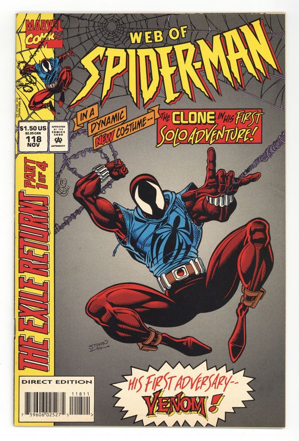 First Printing. Direct Edition. First appearance of the Scarlet Spider (aka Ben Reilly) in The Exile Returns Part 1 of 4. "Memories" Guest-starring Venom. Script by Terry Kavanagh. Art by Steven Butler (breakdowns) and Randy Emberlin (finishes). Cover by Steven Butler. Plot continues from Spectacular Spider-Man 217. Ben Reilly (aka the Spider-Clone) wanders around Manhattan trying to bury the memories of his (and Peter Parker's) past. However Ben knows that with great power comes great responsibility. So he crafts a different -- yet similar -- superhero identity to fight crime. Meanwhile, Venom is back in town and wreaking havoc on the Upper East Side. But the Scarlet Spider vows to stop him! Story continues in Spider-Man (1990) #52. Cameo appearances by Aunt May, Anna Watson, Betty Brant, and Ken Ellis. 32 pages. Cover price $1.50. Grade: FN/VF 7.0 explanation of grade Condition: Used (collectible)